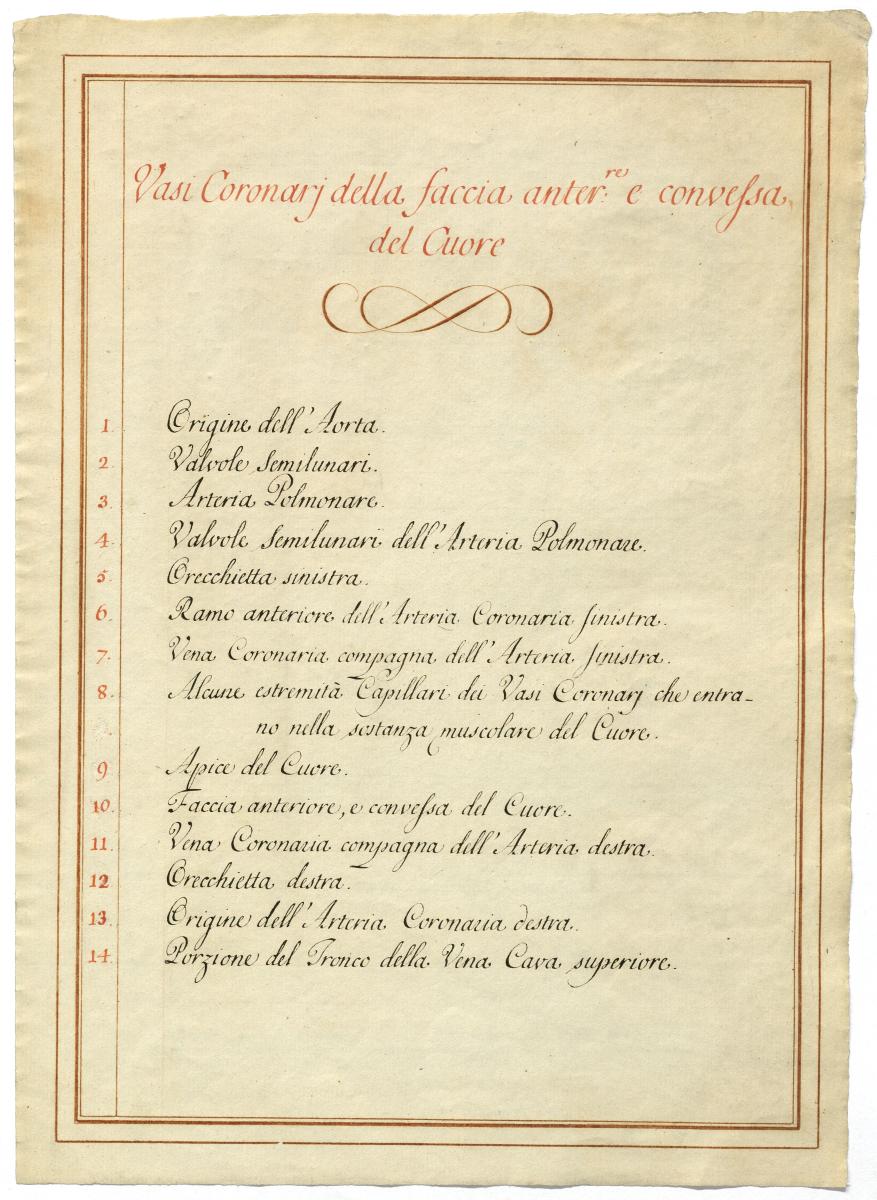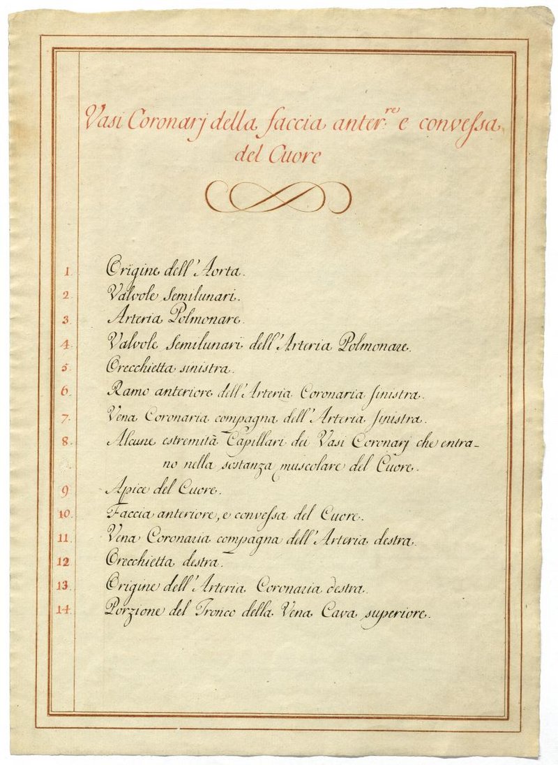 Der Text ist die ergänzende Beschreibung in italienischer Sprache zum anatomischen Wachsmodell des Herzens.