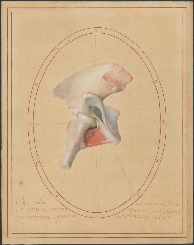 Rechter Beckenknochen (Os coxae) und rechter proximaler Oberschenkelknochen (Femur) von vorne. Musculus quadratus femoris.