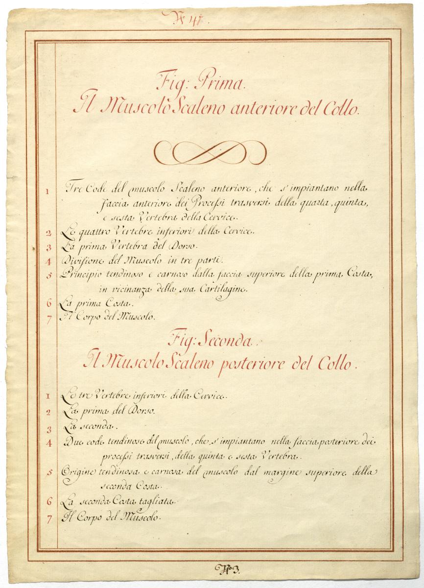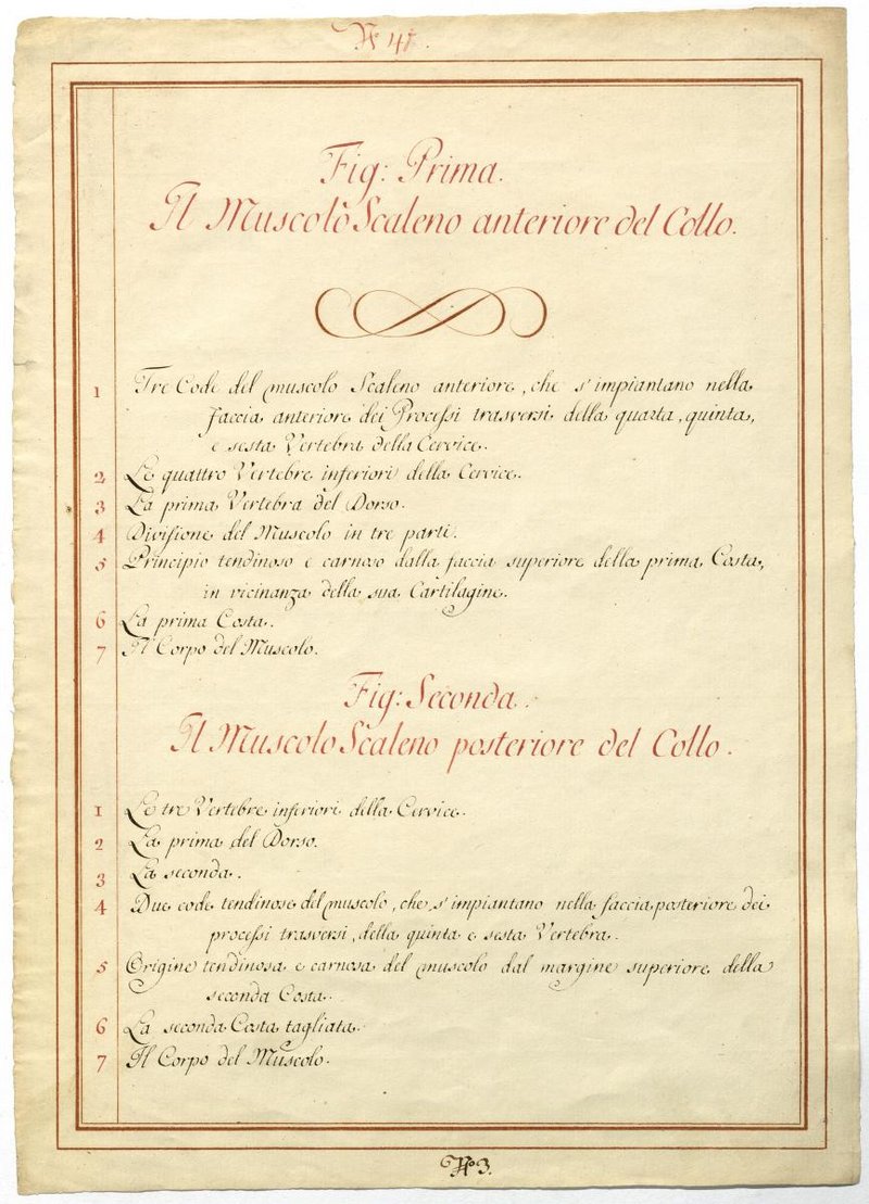 Der Text ist die ergänzende Beschreibung in italienischer Sprache zum anatomischen Wachsmodell der tiefen Halsmuskulatur.