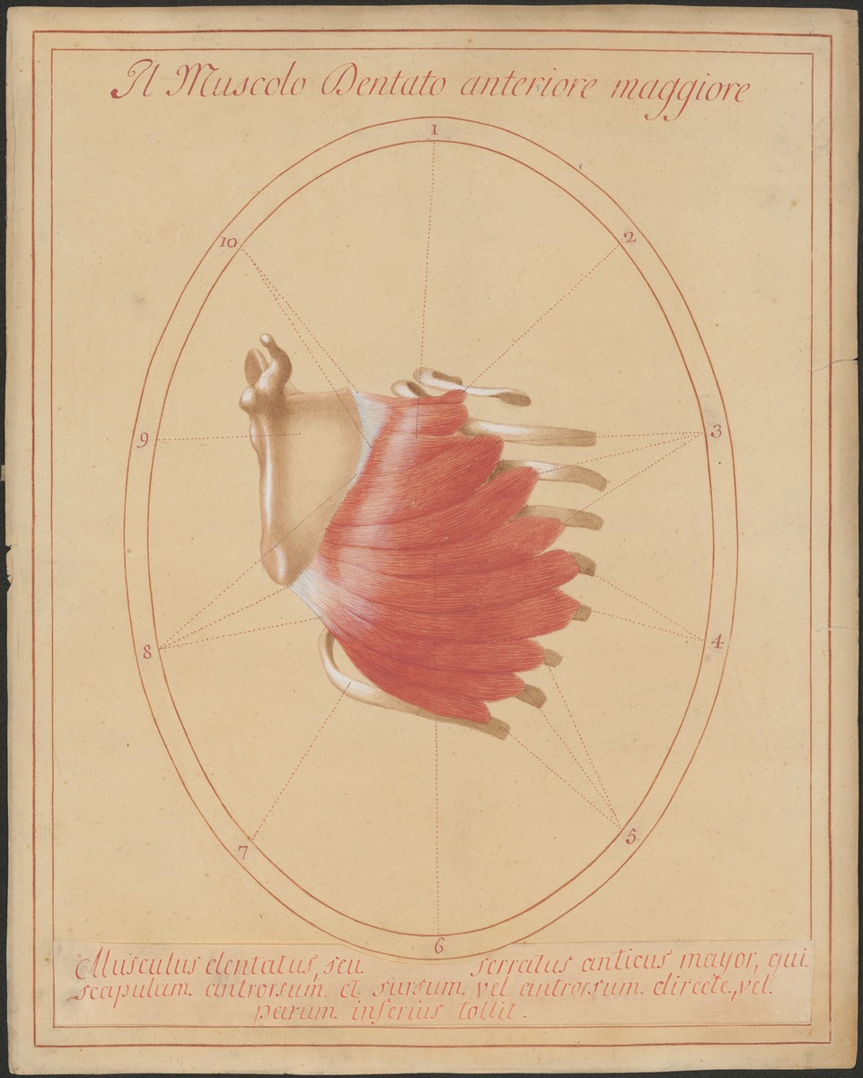 Der vordere Sägemuskel (M. serratus anterior) von vorne seitlich. Das Schulterblatt ist um seinen hinteren Rand (Margo medialis) nach außen umgeschlagen.