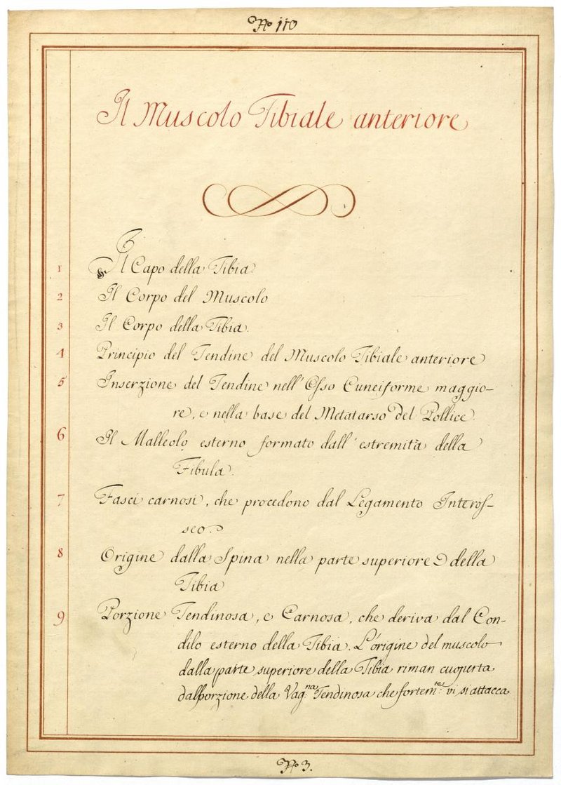 Der Text ist die ergänzende Beschreibung in italiensicher Sprache zum anatomischen Wachsmodell der Schienbeinmuskulatur.