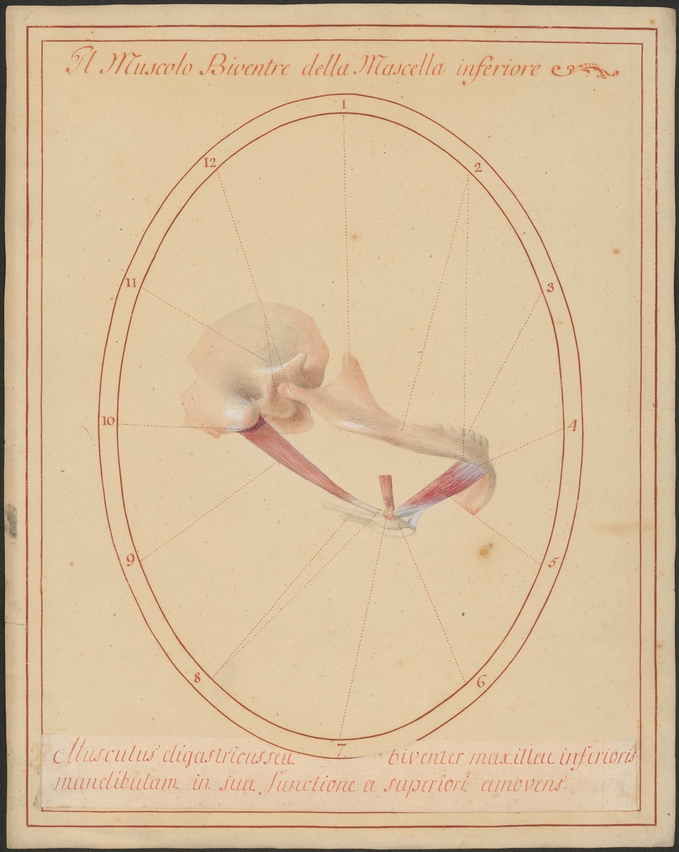 Isolierte Ansicht des linken Schläfenbeins (Os temporale) von lateral und des linken Unterkieferteils von kaudal. So kann man den zweibäuchige Musculus digastricus mit der Befestigung seiner Zwischensehne am Zungenbein (Os hyoideum) und den Ansatz des Musculus stylohyoideum ebendort erkennen.
