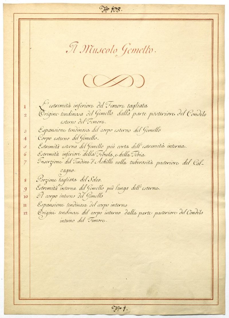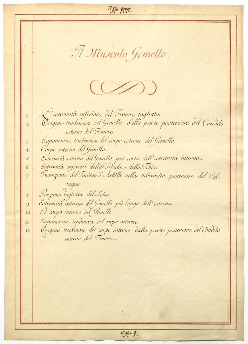 Der Text ist die ergänzende Beschreibung in italienischer Sprache zum anatomischen Wachsmodell der oberflächlichen Beugerloge des Unterschenkels.