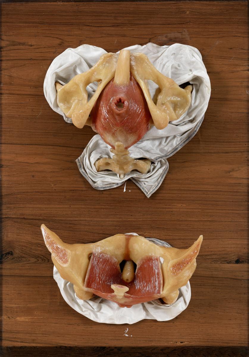 1. Der äußere Schließmuskel des Afters (Musculus sphincter ani externus) und der Musculus levator ani in der Ansicht von außen. 2. Der äußere Schließmuskel des Afters (Musculus sphincter ani externus), der Musculus levator ani und der Musculus coccygeus in der Ansicht von innen nach vorne.