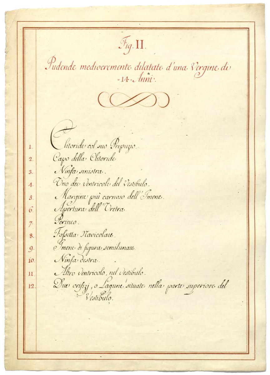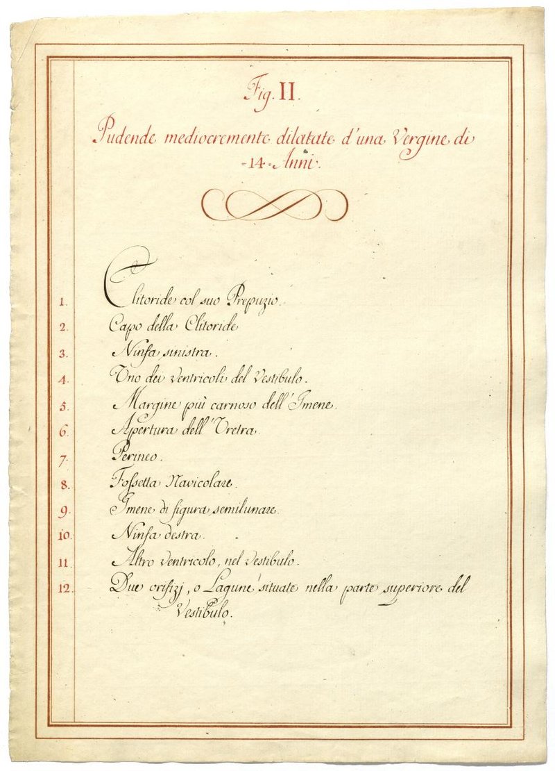 Der Text ist die ergänzende Beschreibung in italienischer Sprache zum anatomischen Wachsmodell der Entwicklung der weiblichen äußeren Geschlechtsteile.