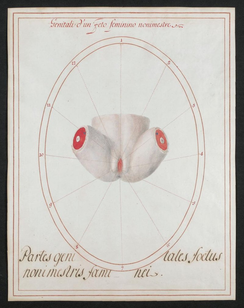 Die äußeren Geschlechtsteile (Partes genitales externae) eines weiblichen Fötus von neun Monaten.