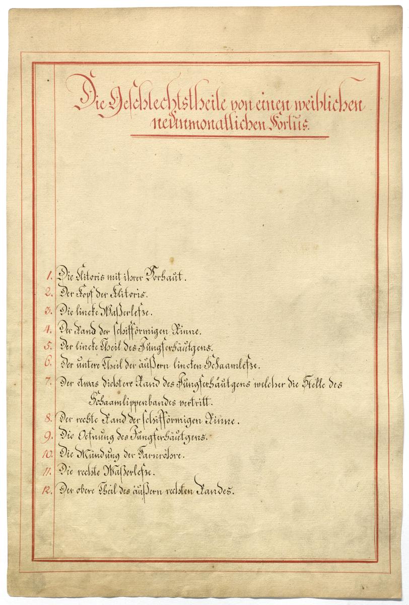 Der Text ist die ergänzende Beschreibung in deutscher Sprache zum anatomischen Wachsmodell der Entwicklung der weiblichen äußeren Geschlechtsteile.