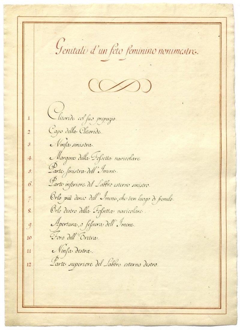 Der Text ist die ergänzende Beschreibung in italienischer Sprache zum anatomischen Wachsmodell der Entwicklung der weiblichen äußeren Geschlechtsteile.