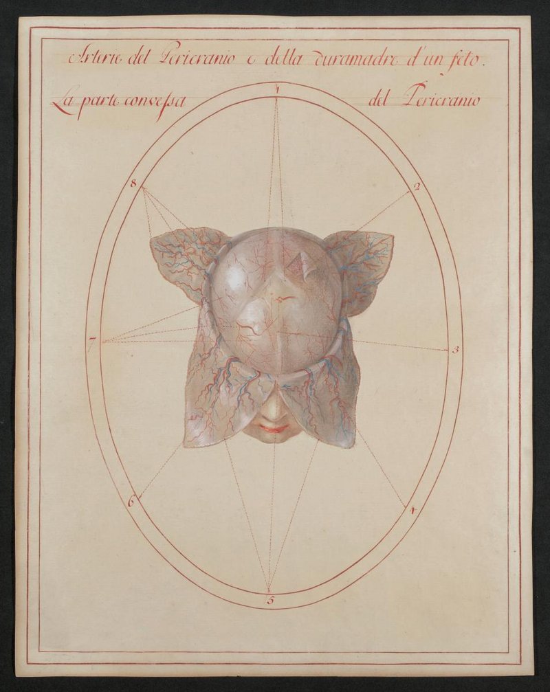Die Gefäße der harten Hirnhaut (Vasa meningea) bei einem menschlichen Fötus nach Entfernen des Schädeldaches (Kalotte).