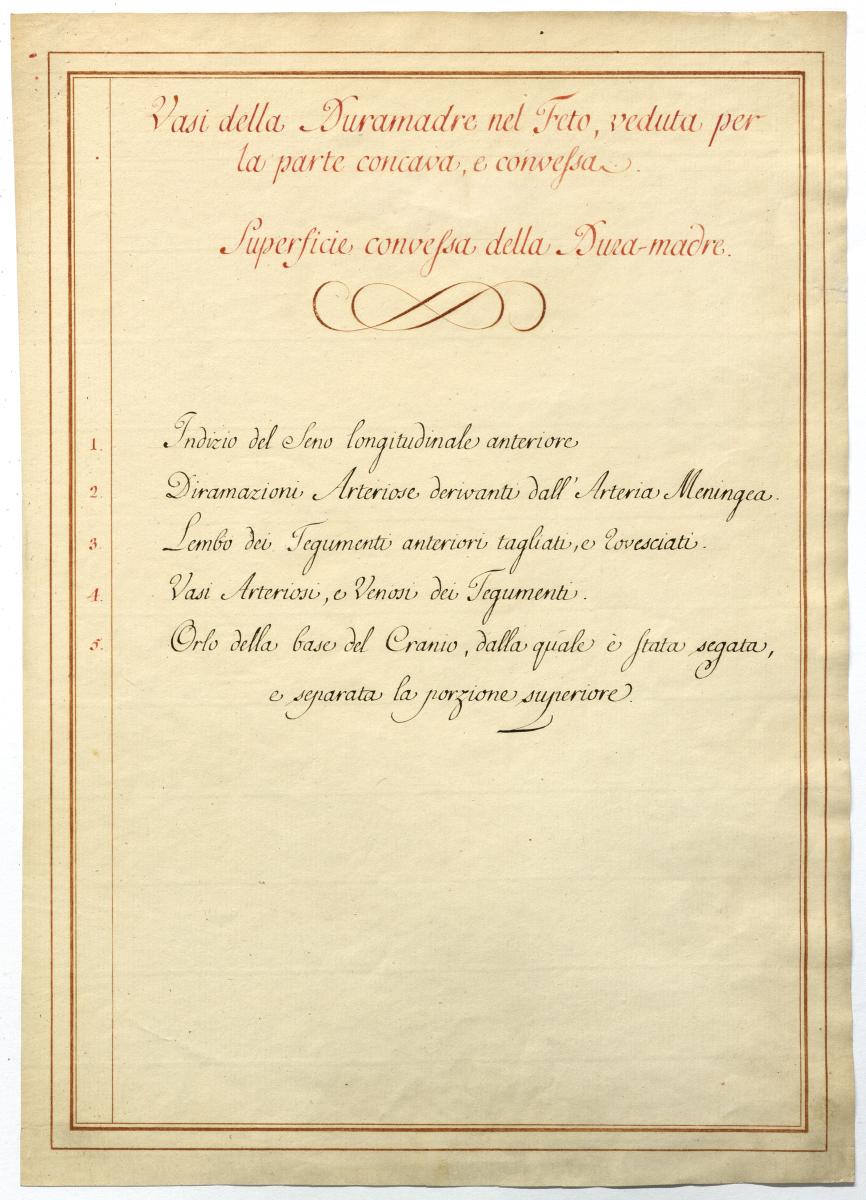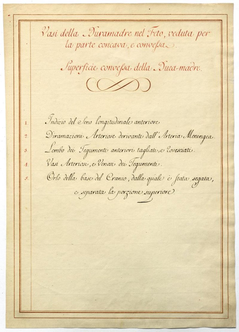 Der Text ist die ergänzende Beschreibung in italienischer Sprache zum anatomischen Wachsmodell der Meningealgefäße.
