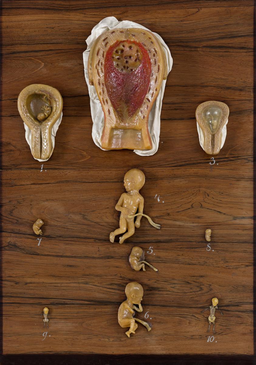 1. Die aufgeschnittene Gebärmutter (Uterus) am Ende des zweiten Schwangerschaftsmonates. Der Embryo ist durch die Schafhaut (Amnion) zu sehen. 2. Die hintere Innenfläche der Gebärmutter (Uterus) am Ende des vierten Schwangerschaftsmonates. 3. Die aufgeschnittene Gebärmutter (Uterus) aus dem zweiten bis dritten Schwangerschaftsmonat; der Embryo ist durch die Schafhaut (Amnion) zu sehen. 4. Ein Fötus von ungefähr drei Monaten. 5. Ein Embryo von ungefähr 40 Tagen. 6. Ein Fötus von cirka zweieinhalb Monaten. 7. Ein Embryo von ungefähr einem Monat. 8. Ein Embryo von ungefähr 25 Tagen. 9. und 10. Skelette von zwei Föten aus dem dritten und vierten Schwangerschaftsmonat.