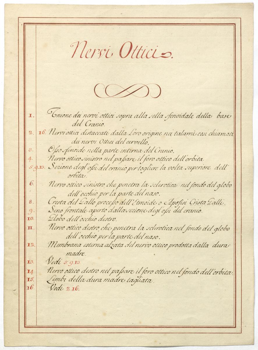Der Text ist die ergänzende Beschreibung in italienischer Sprache zum anatomischen Wachsmodell der Hilfsmittel des Auges.