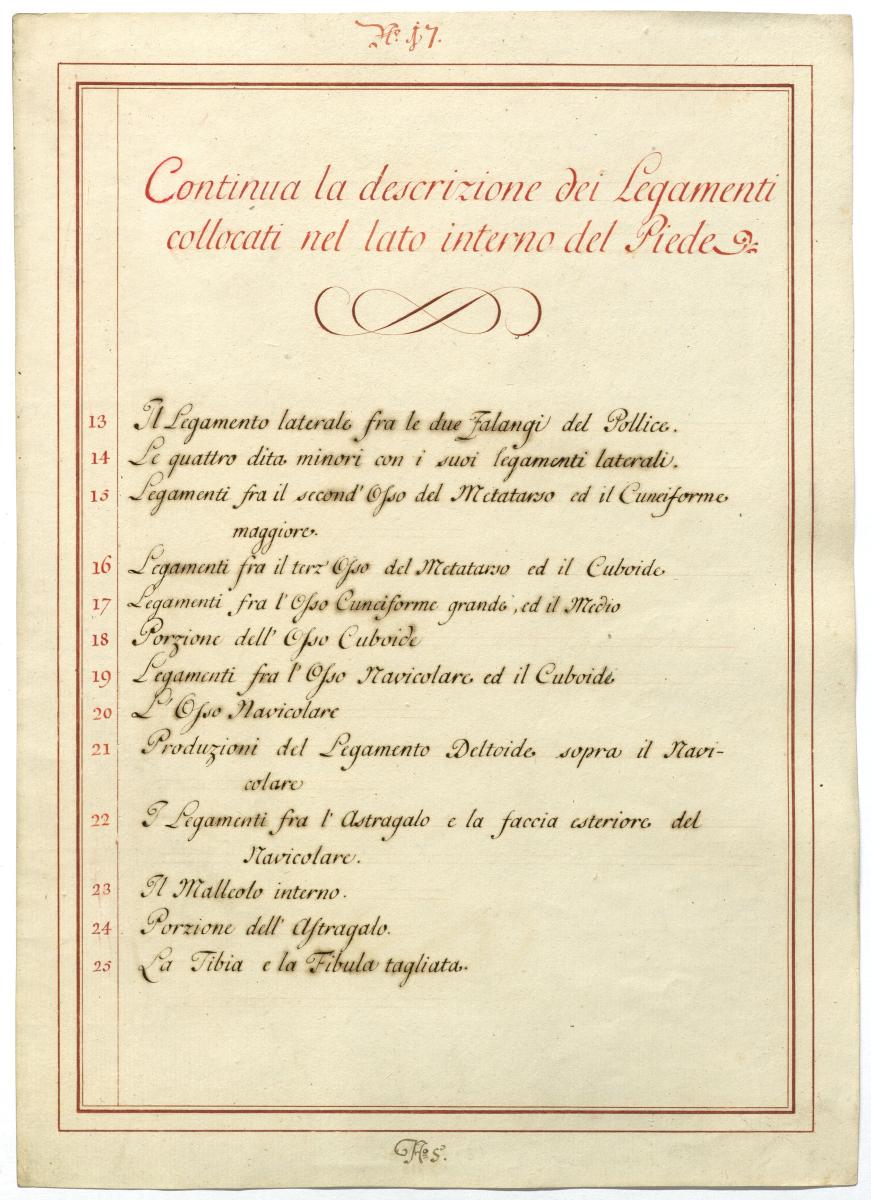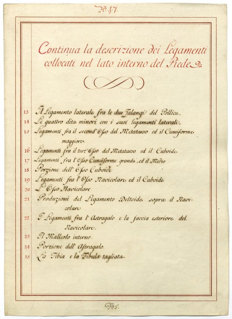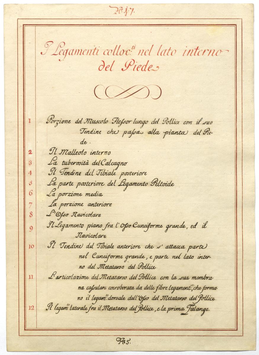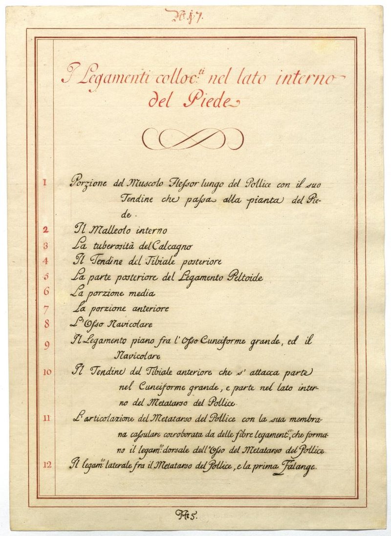 Der Text ist die ergänzende Beschreibung in italienischer Sprache zum anatomischen Wachsmodell des Fußes.