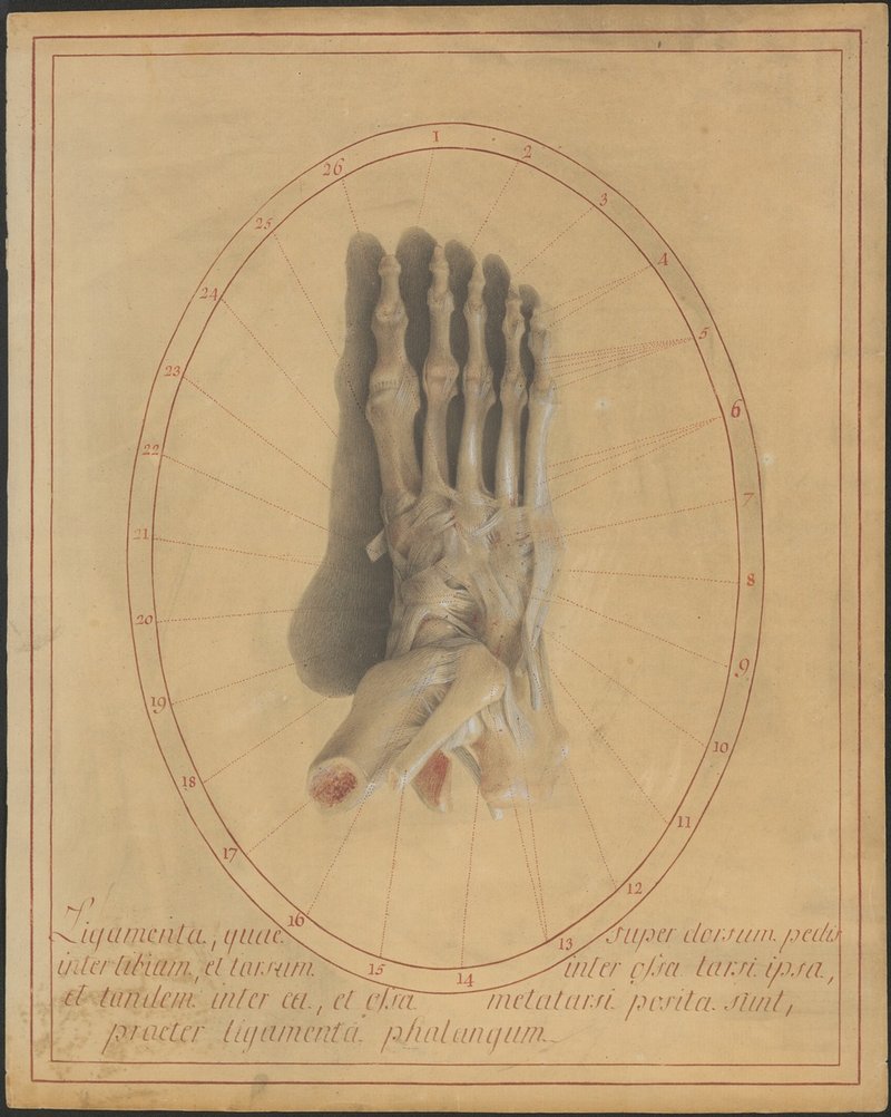 Die Bänder des Fußrückens zwischen Schienbein (Tibia), Fußwurzel (Tarsus), Mittelfuß (Metatarsus) und Zehen (Digiti): die Ansicht des rechten Fußes inklusive Knöchelregion von vorne. Haut, Unterhautfettgewebe sowie Muskel und Muskelsehnen sind entfernt und die Bänder des Fußrückens zwischen Schienbein (Tibia), Fußwurzel (Tarsus), Mittelfuß (Metatarsus) und Zehen (Digiti) wurden dargestellt: die Seitenbänder der Zehengelenke (Ligamenta collateralia), die dorsalen Mittelfußbänder (Ligamenta metatarsea dorsalia), die dorsalen Bänder zwischen Fußwurzel und Mittelfuß (Ligamenta tarsometatarsea dorsalia), das dorsale Band zwischen Fersenbein und Würfelbein (Ligamentum calcaneocuboideum dorsale), das dorsale Band zwischen lateralem Keilbein und Würfelbein (Ligamentum cuneocuboideum dorsale), der vordere und seitliche Anteil des äußeren Seitenbandkomplexes (Ligamentum collaterale laterale) mit dem Ligamentum tibiofibulare anterius sowie dem Ligamentum calcaneofibulare, das zweigeteilte Band zwischen Fersenbein und Kahnbein sowie Würfelbein (Ligamentum bifurcatum), der vordere Anteil des inneren Seitenbandkomplexes (Ligamentum collaterale mediale mit dem Ligamentum deltoideum sowie dem Ligamentum tibiotalare anterius und das dorsale Band zwischen dem inneren Keilbei und dem Kahnbein (Ligamentum cuneonaviculare dorsale).
