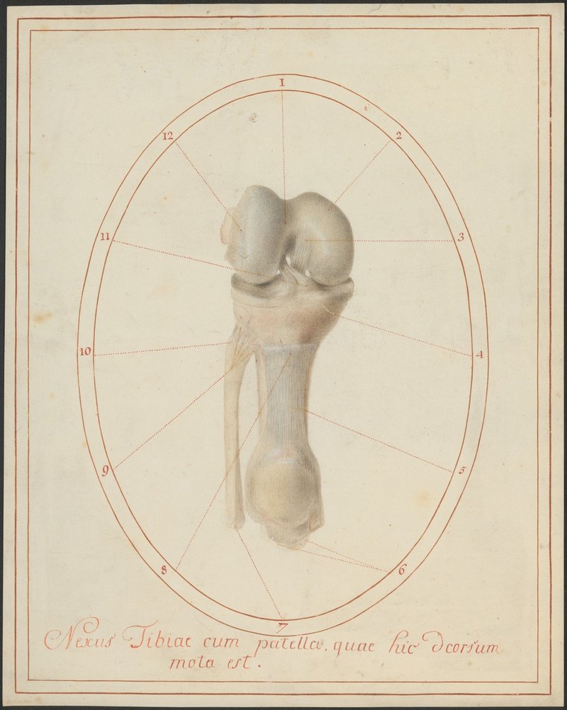 Rechtes gebeugtes Kniegelenk von vorne. Die Kapsel wurde eröffnet, die Kniescheibe (Patella) am Ligamentum patellae hängend nach unten geklappt. Das Ligamentum patellae wurde begrenzt und die Schleimhautduplikaturen des Gelenkes sowie der Hoffa’sche Fettkörper wurden entfernt, sodass die mittig liegenden Kreuzbänder sowie die Vorderhörner der Menisken zur Ansicht kommen.