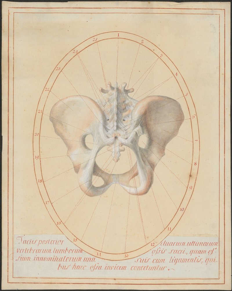 Ansicht der letzten drei Lendenwirbel, des Kreuzbeines und beider Beckenknochen von dorsal: dorsale Bandverbindungen der Wirbelsäule (Ligamentum supraspinale, Ligamenta interspinalia) sowie die von dorsal ansichtigen Bänder des Beckenringes sind dargestellt. Die Bänder des Beckenringes unterteilen sich in die Bandverbindungen zur Lendenwirbelsäule (Ligamentum iliolumbale) und die Bandverbindungen des Sakroiliakalgelenks (Ligamenta sacroiliaca dorsalia; Ligamentum sacrospinale sowie Ligamentum sacrotuberale). Zusätzlich sieht man die Bandverbindungen zum Steißbein (Ligamenta sacrococcygea dorsalia superficialia). Die beiden Beckenknochen sind ventral durch die Schambeinfuge (Symphysis pubica) miteinander verbunden.