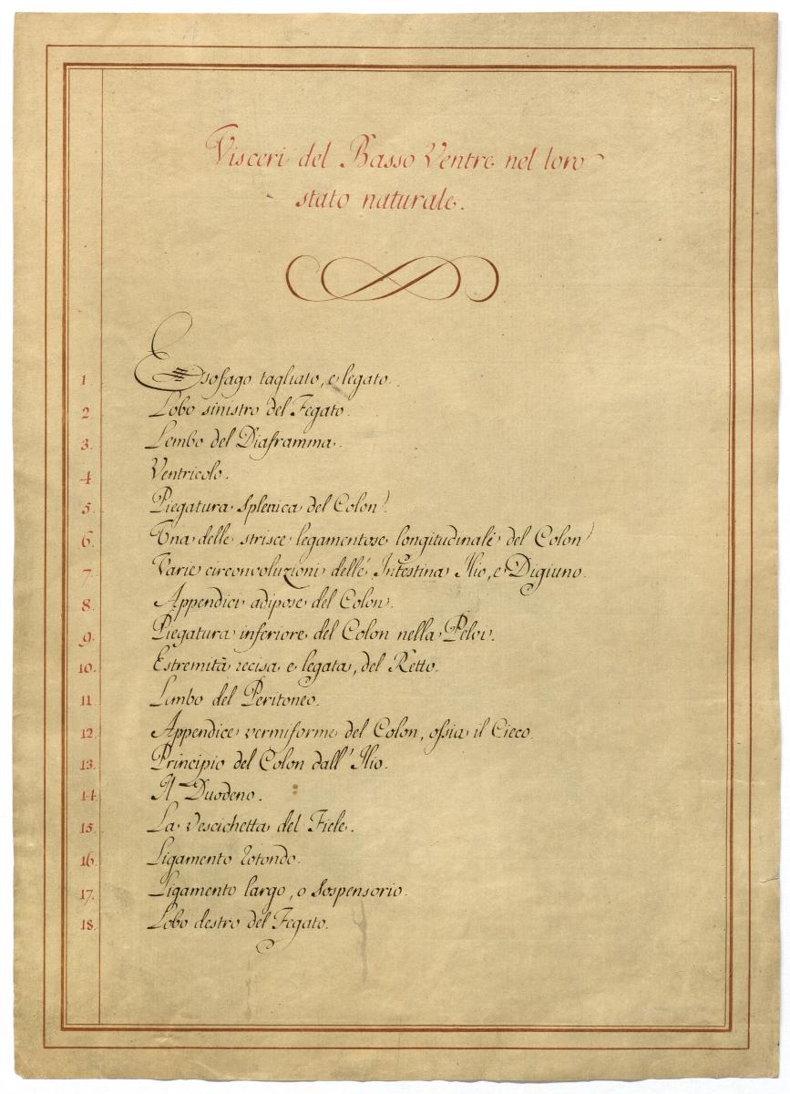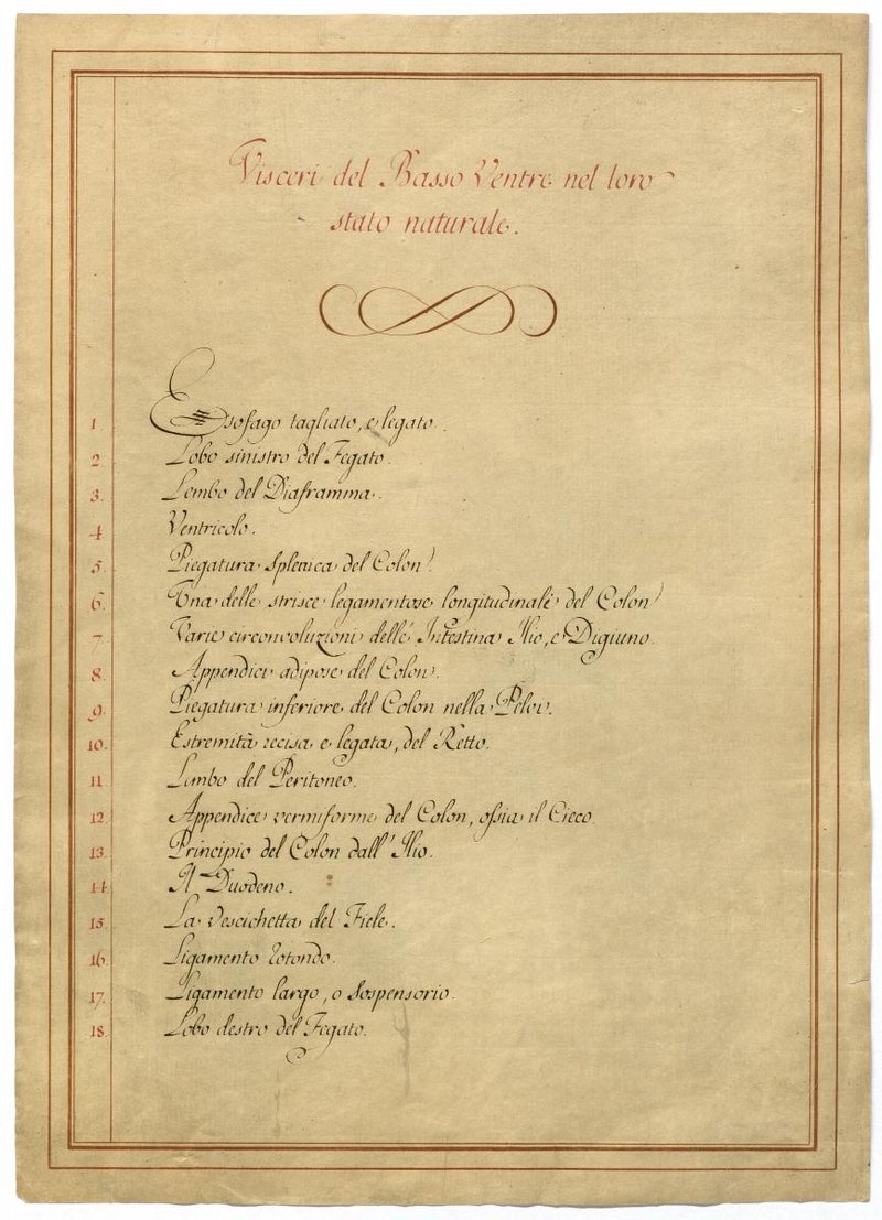 Der Text ist die ergänzende Beschreibung in italienischer Sprache zum anatomischen Wachsmodell der Bauchorgane.