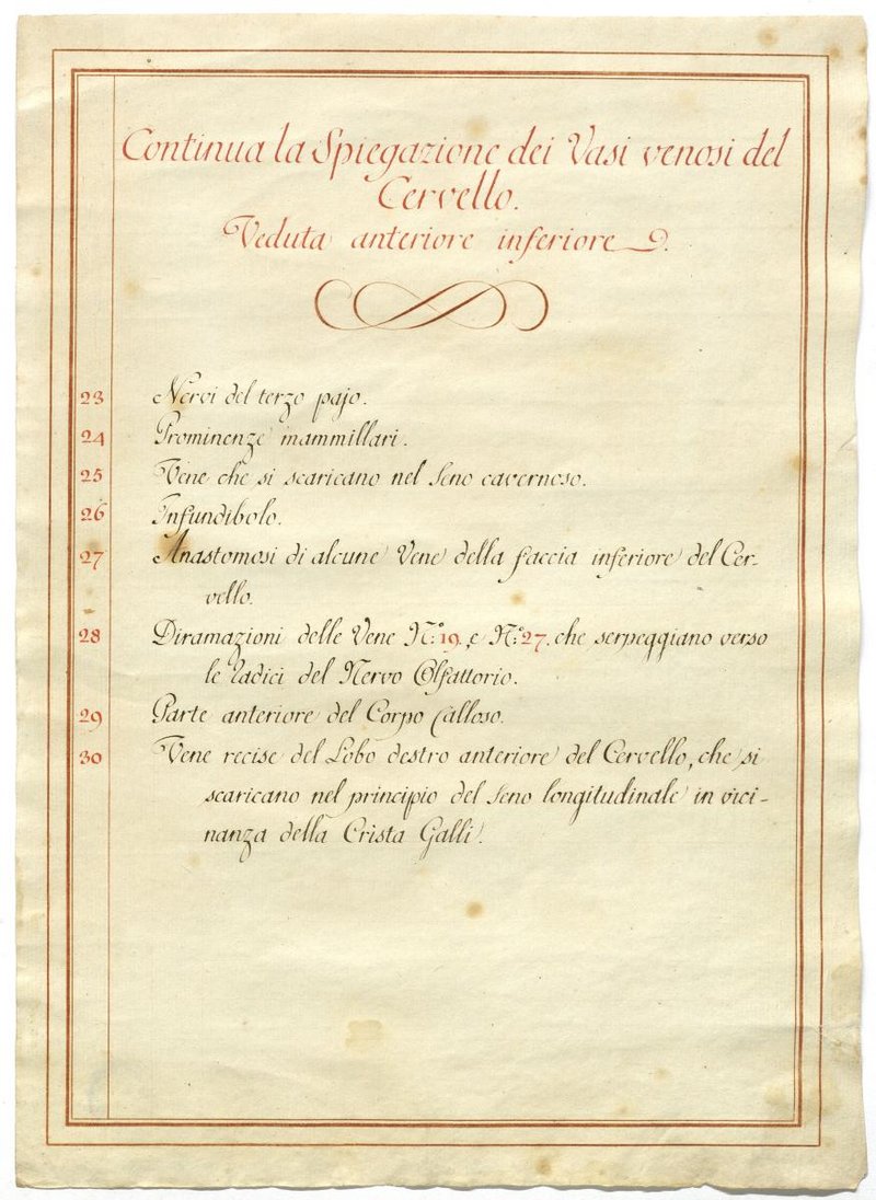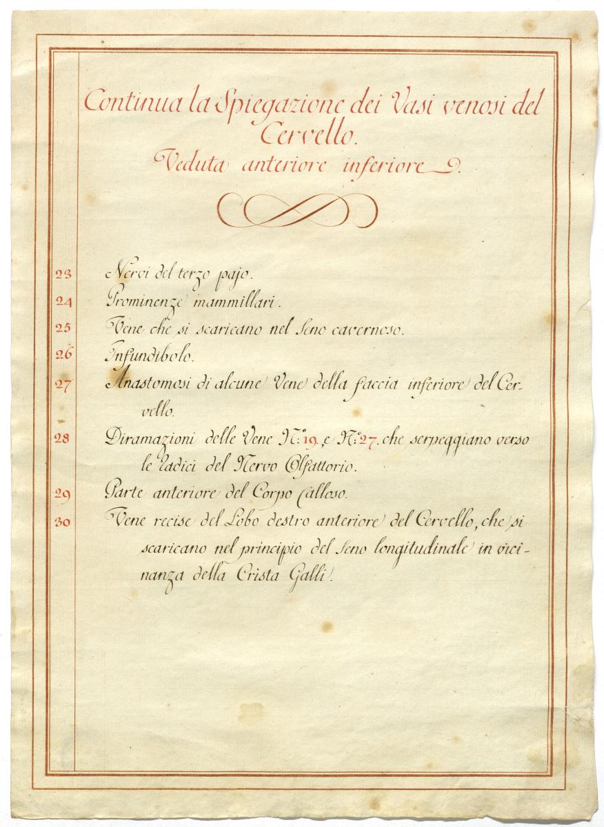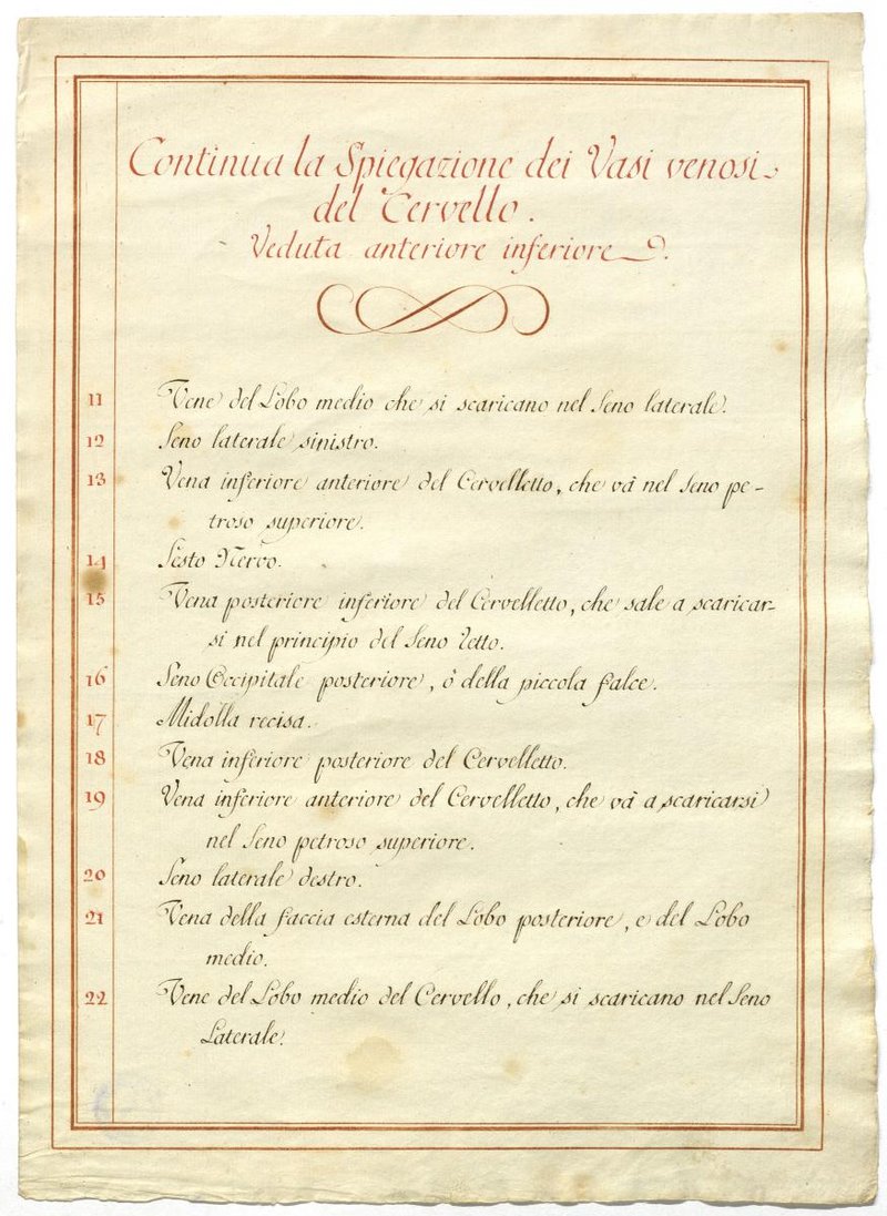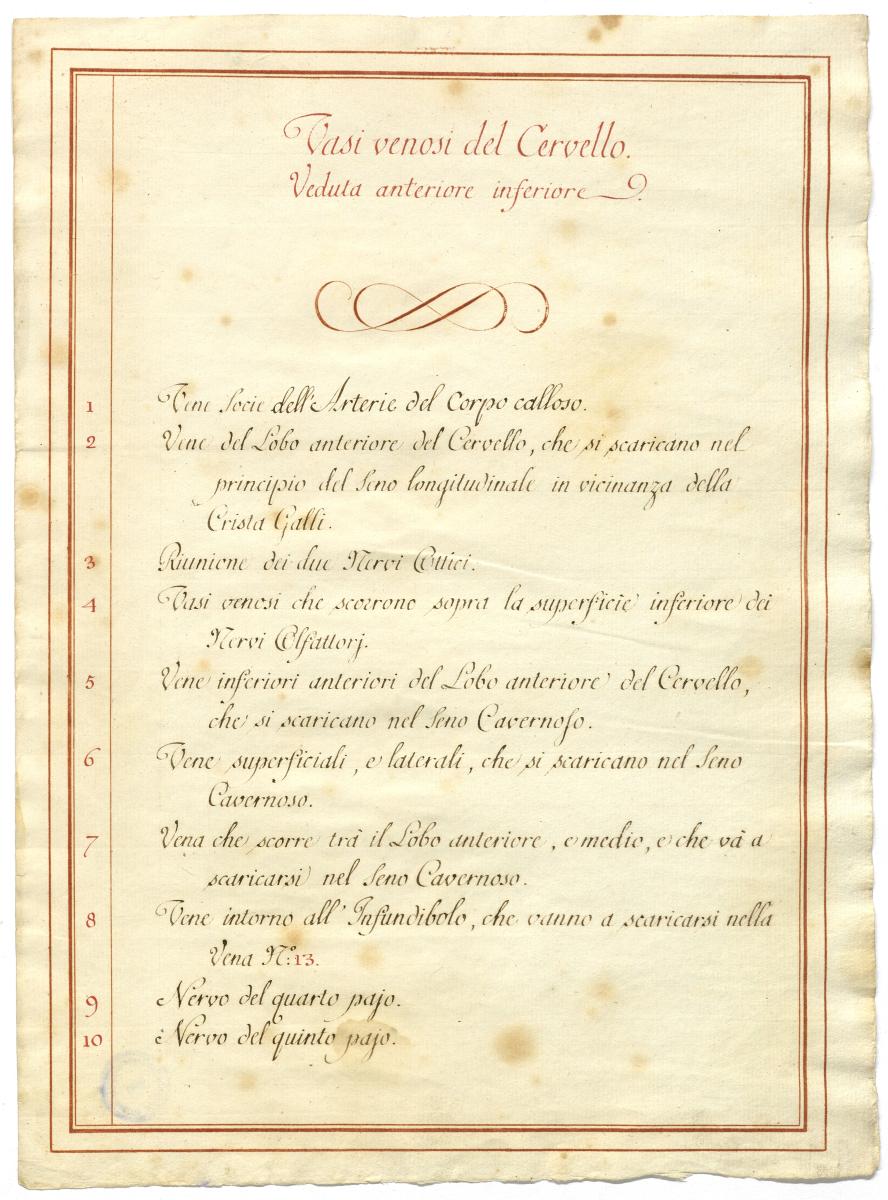 Der Text ist die ergänzende Beschreibung in italienischer Sprache zum anatomischen Wachsmodell der Gehirnvenen.