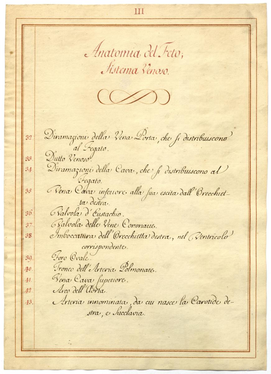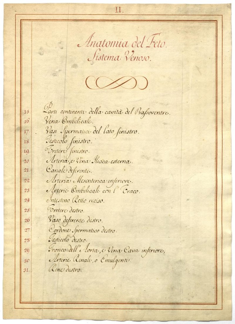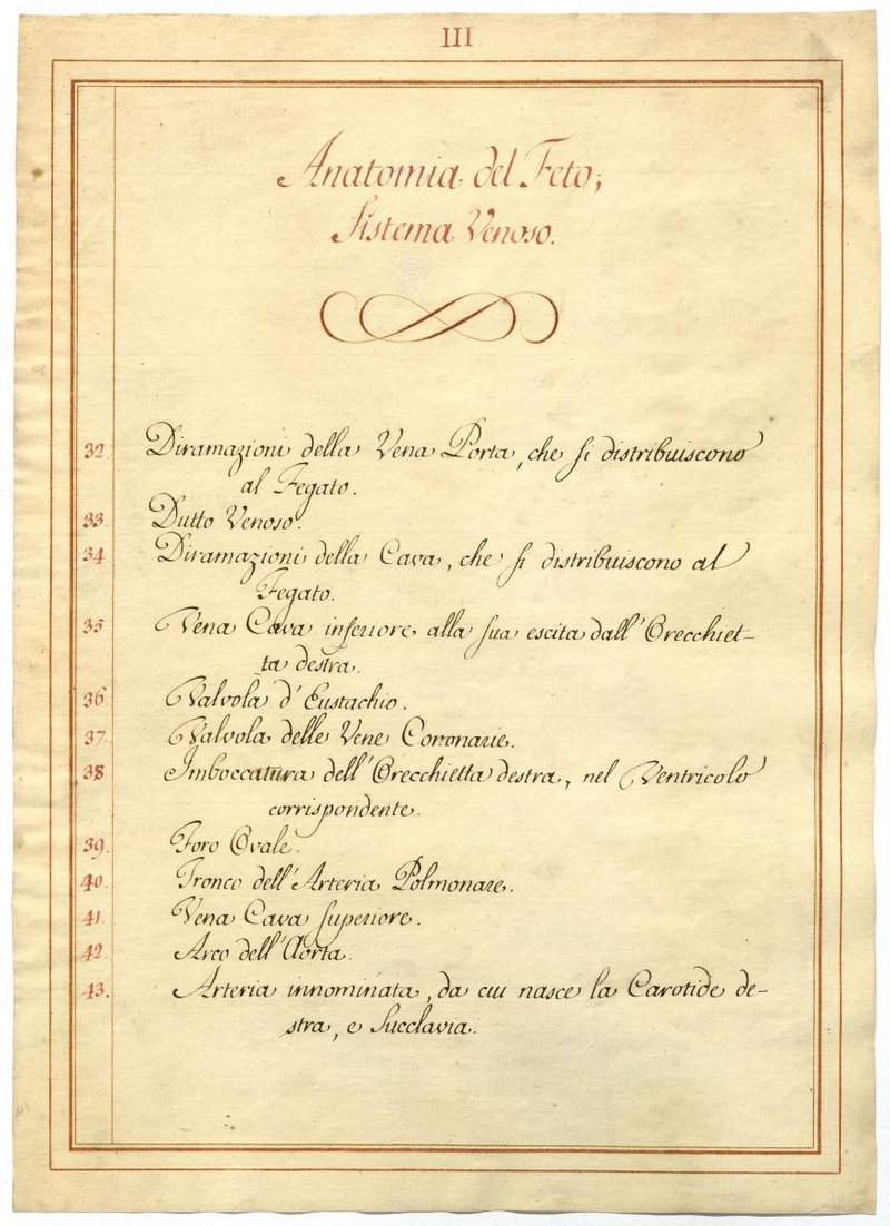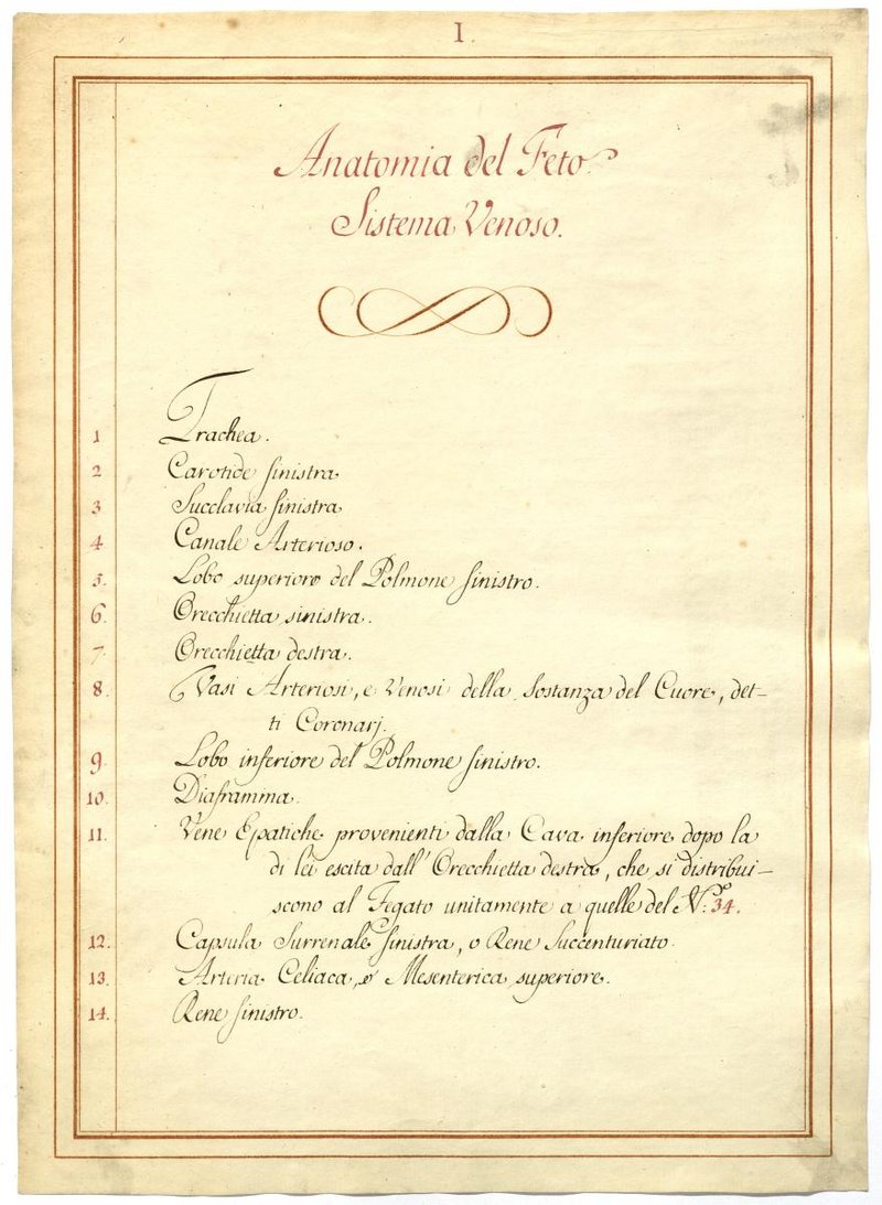 Der Text ist die ergänzende Beschreibung in italienischer Sprache zum anatomischen Wachsmodell eines Fetus.