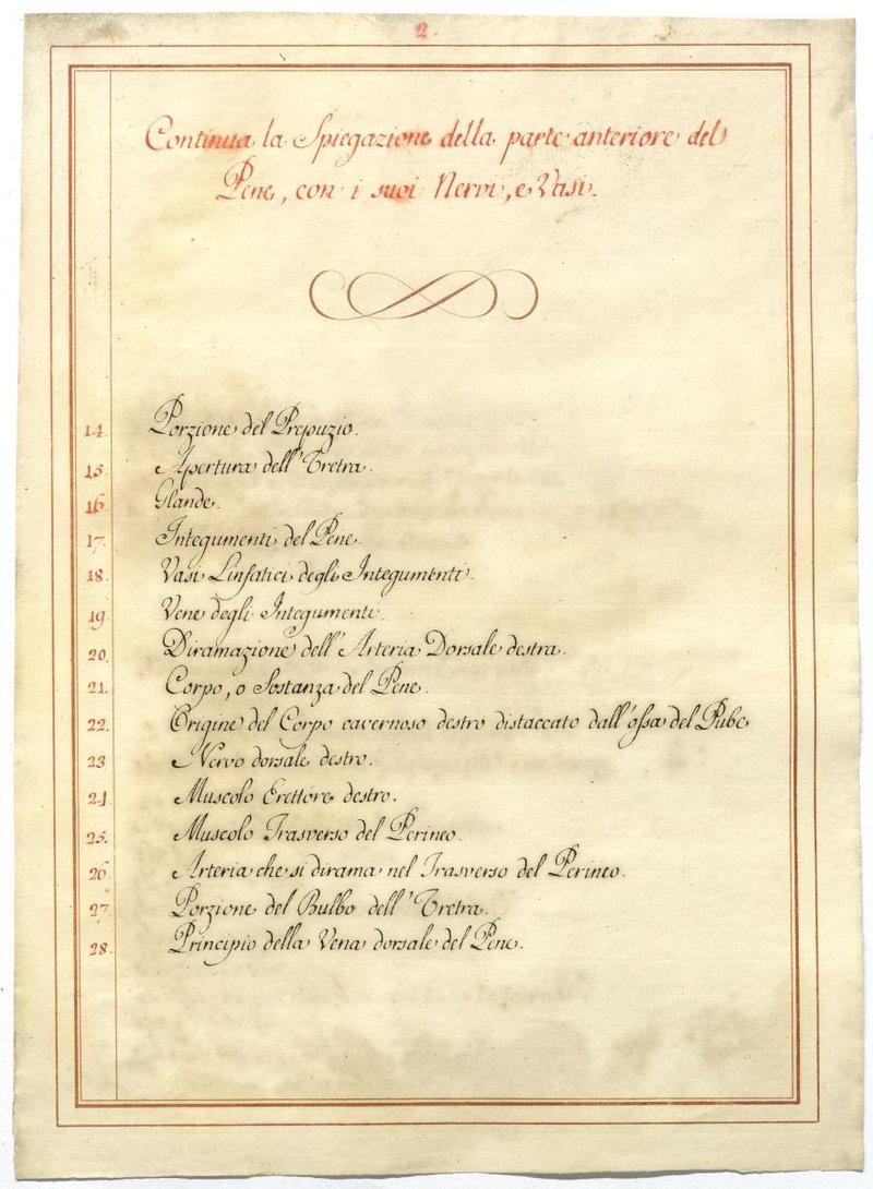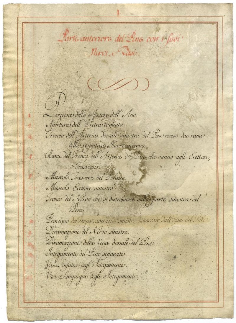 Der Text ist die ergänzende Beschreibung in italienischer Sprache zum anatomischen Wachsmodell der äußeren männlichen Genitale.