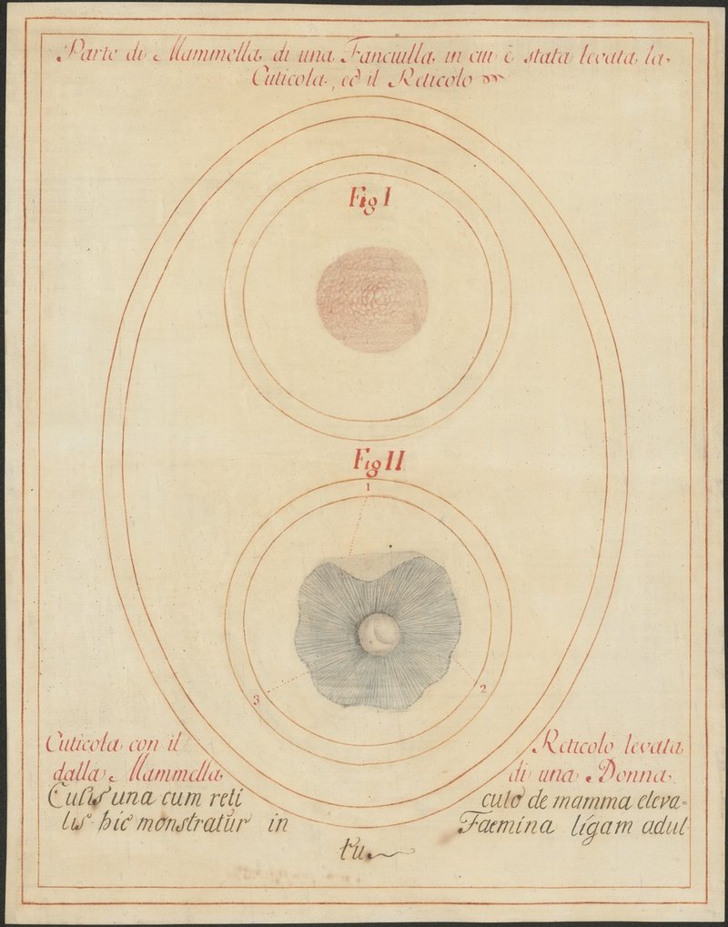 Fig. 1: 238/4: Die von ihrer Haut entblößte Brustwarze (Papilla mammae) eines präpubertären Mädchens. Fig. 2: 238/5: Die abgezogene Haut im Bereich der Brustwarze (Papilla mammae) einer erwachsenen Frau.