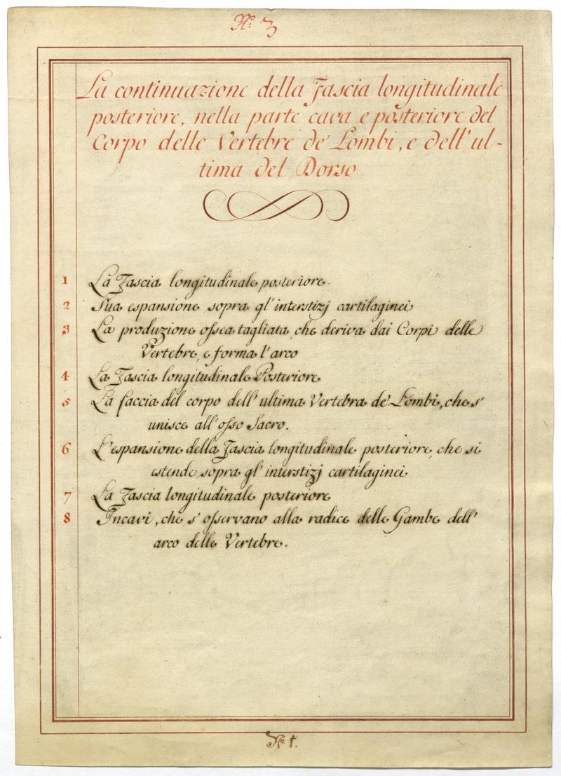 Der Text ist die ergänzende Beschreibung in italienischer Sprache zum anatomischen Wachsmodell der Knochen und Bänder im Lendenwirbel- und Brustwirbel-Bereich.