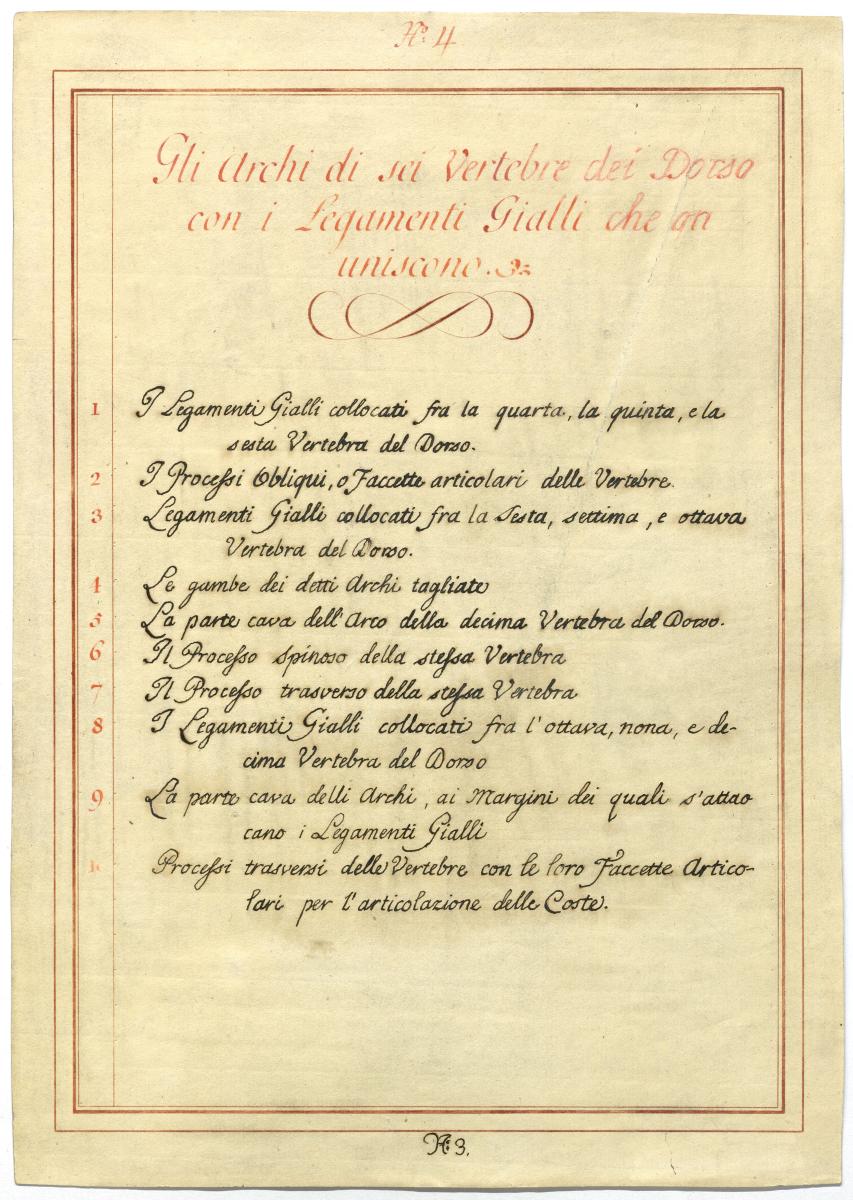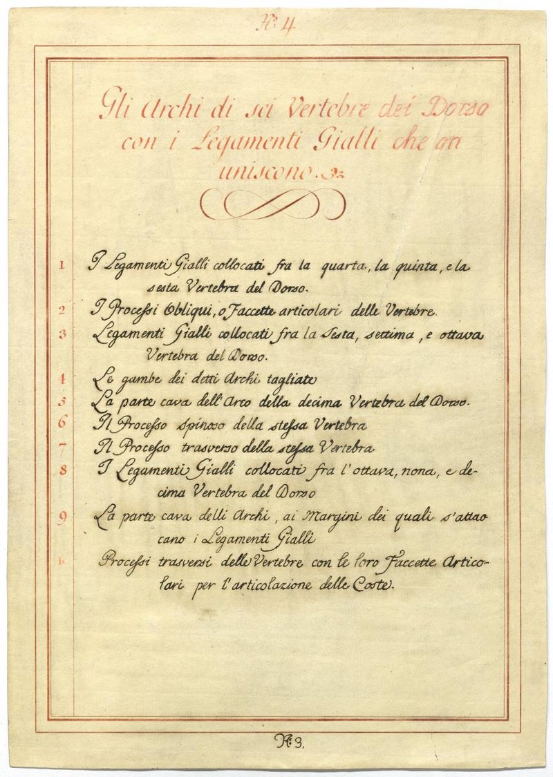 Der Text ist die ergänzende Beschreibung in italienischer Sprache zum anatomischen Wachsmodell der Brustwirbelsäule und der Rippen.