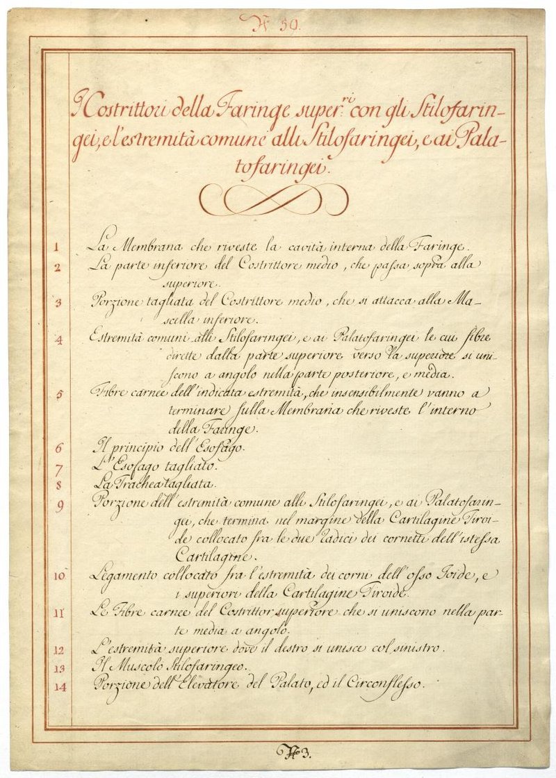 Der Text ist die ergänzende Beschreibung in italienischer Sprache zum anatomischen Wachsmodell der Rachenmuskulatur.