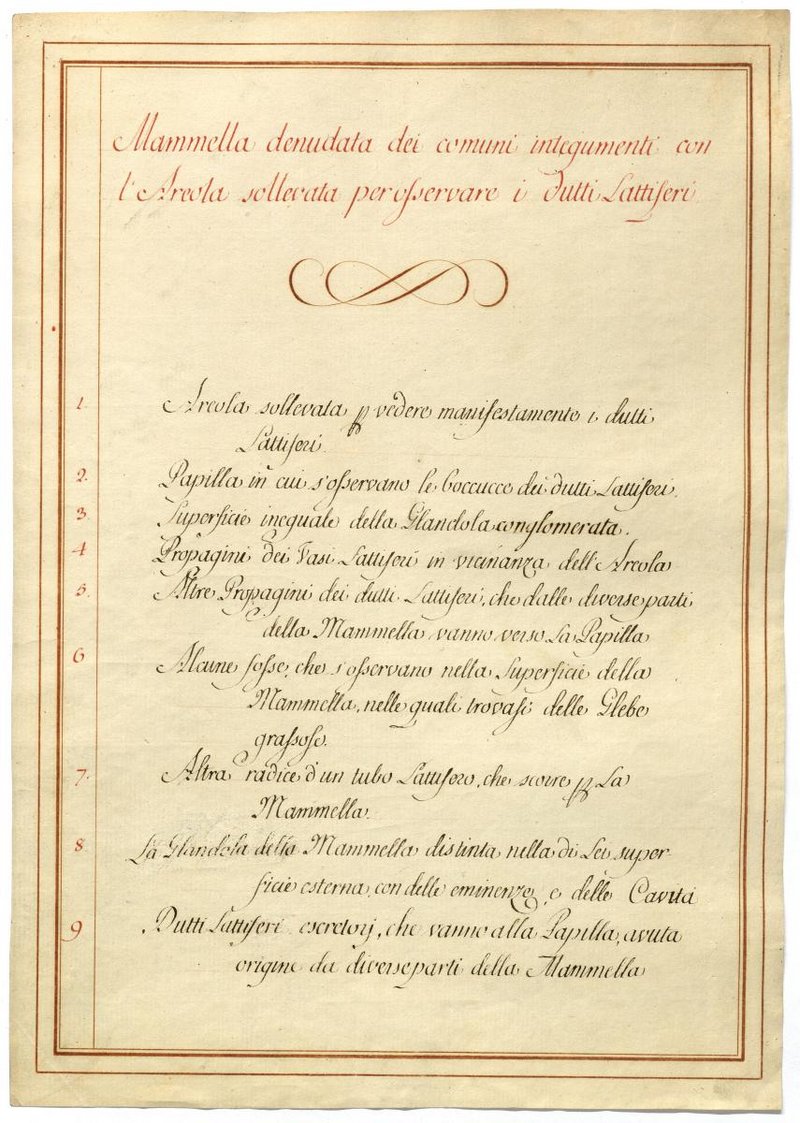 Der Text ist die ergänzende Beschreibung in italienischer Sprache zum anatomischen Wachsmodell der Brustdrüse.
