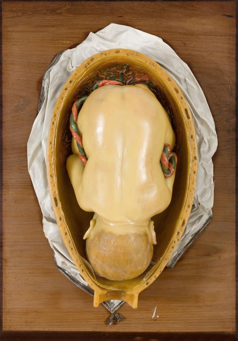 1. Die von vorn eröffnete Gebärmutter (Uterus), in der ein reifer Fötus (Fetus), der Mutterkuchen (Placenta) und der hintere Teil der Eihäute, nämlich der Schafhaut (Amnion), der Zottenhaut (Chorion) und der Siebhaut (Membranae deciduae) zu sehen ist.