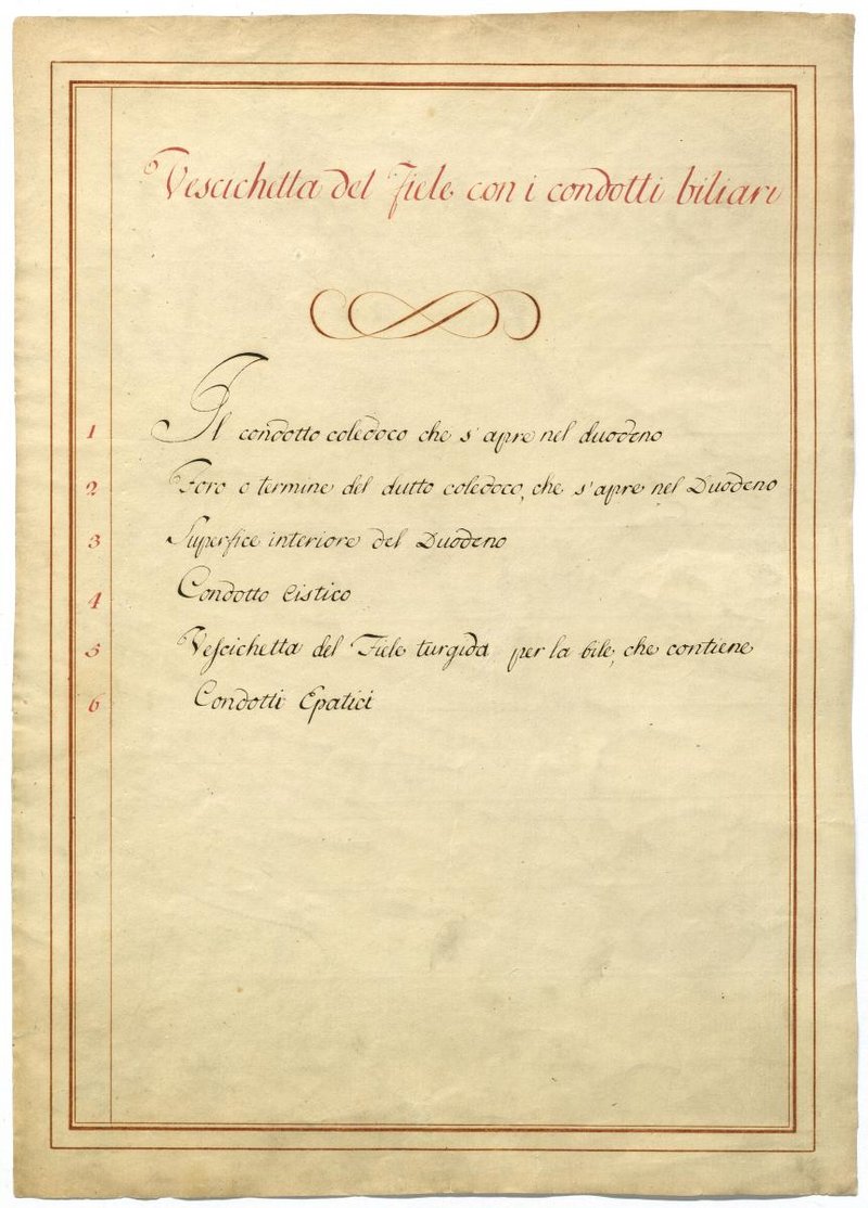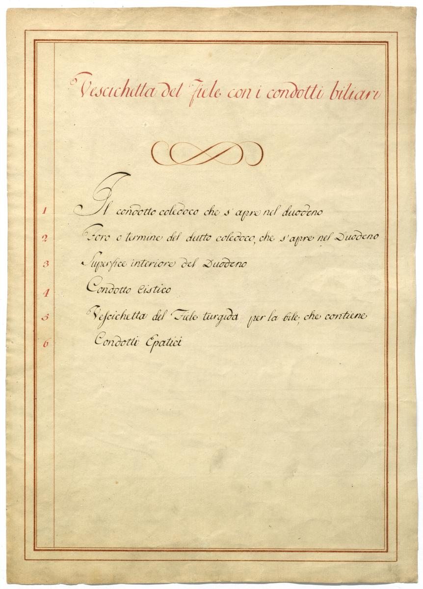Der Text ist die ergänzende Beschreibung in italienischer Sprache zum anatomischen Wachsmodell der Leber und Gallenwege.