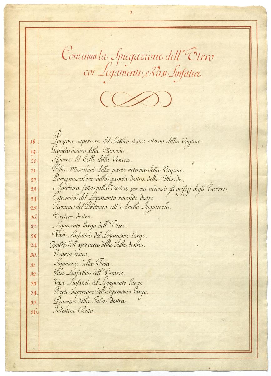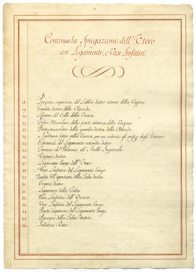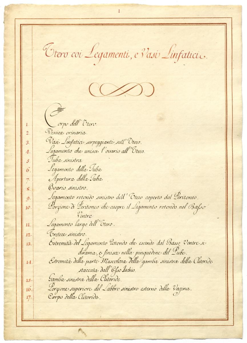 Der Text ist die ergänzende Beschreibung in italienischer Sprache zum anatomischen Wachsmodell des weiblichen Genitale.