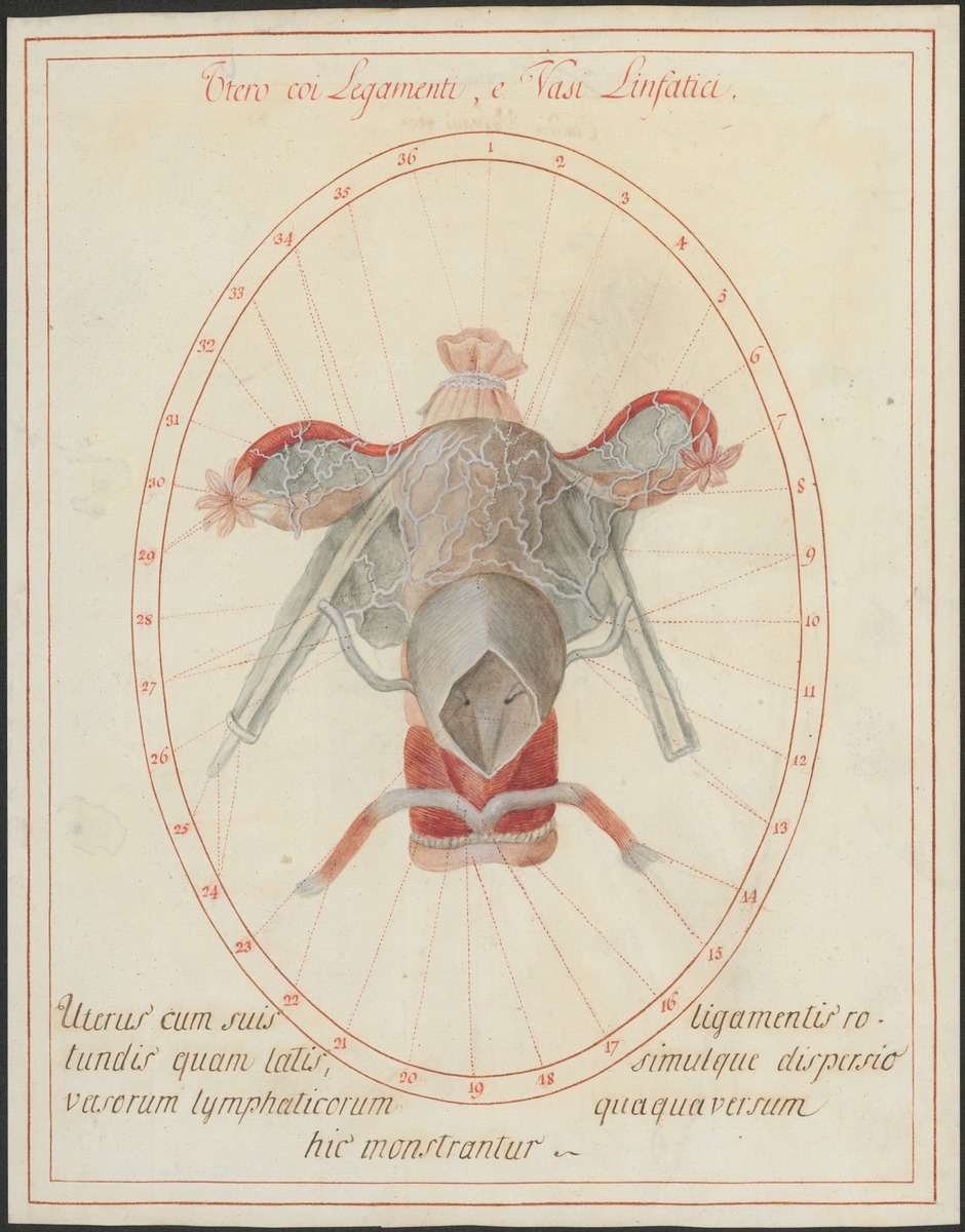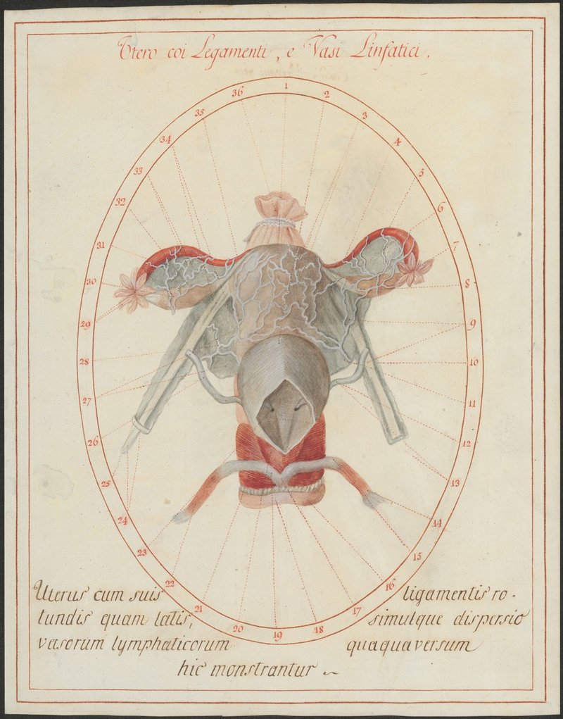 Die Gebärmutter (Uterus), die Eileiter (Tubae uterinae), die Eierstöcke (Ovaria), die Harnblase (Vesica urinaria), von vorne eröffnet, die runden Mutterbänder (Ligamenta teretia uteri) und die Lymphgefäße (Vasa lymphatica, vergrößert dargestellt) dieses Bereiches. Hinter dem Uterus ist der Dickdarm mit einer Schleife verschlossen dargestellt.