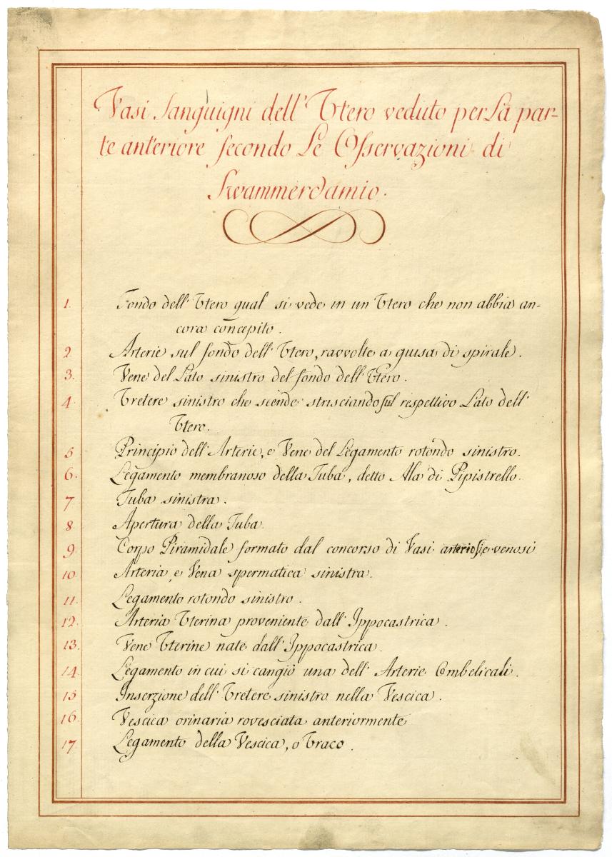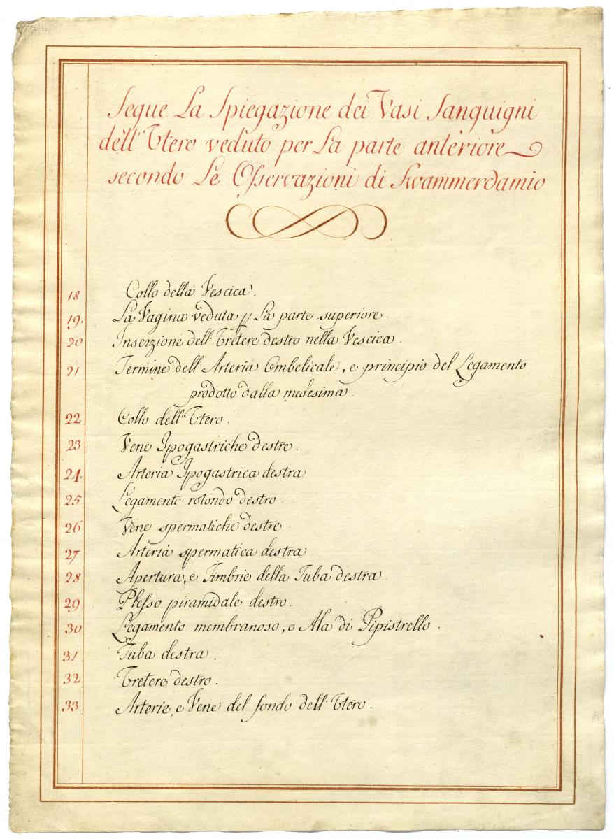 Der Text ist die ergänzende Beschreibung in italienischer Sprache zum anatomischen Wachsmodell des weiblichen Genitale.