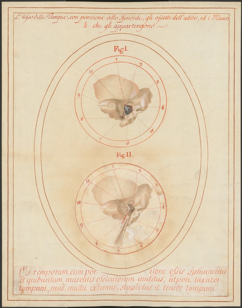 Fig 2: 316/1: Der Musculus tensor tympani, der Musculus stapedius und die Ohrtrompete (Tuba auditiva [Eustachii]) an einem linken Schläfenbein (Os temporale). Fig 1: 316/2: Die Gehörknöchelchen (Ossicula auditus) und deren Muskeln (Musculus tensor tympani et m. stapedius), durch Entfernung eines Teiles des äußeren Gehörganges an einem linken Schläfenbein (Os temporale) dargestellt.