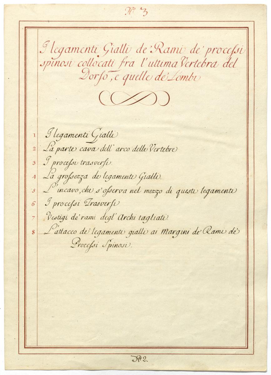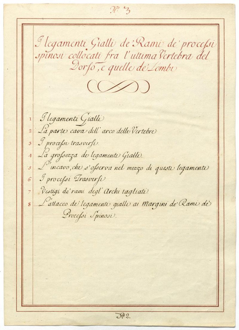 Der Text ist die ergänzende Beschreibung in italienischer Sprache zum anatomischen Wachsmodell der Knochen und Bänder im Lendenwirbel- und Brustwirbel-Bereich.