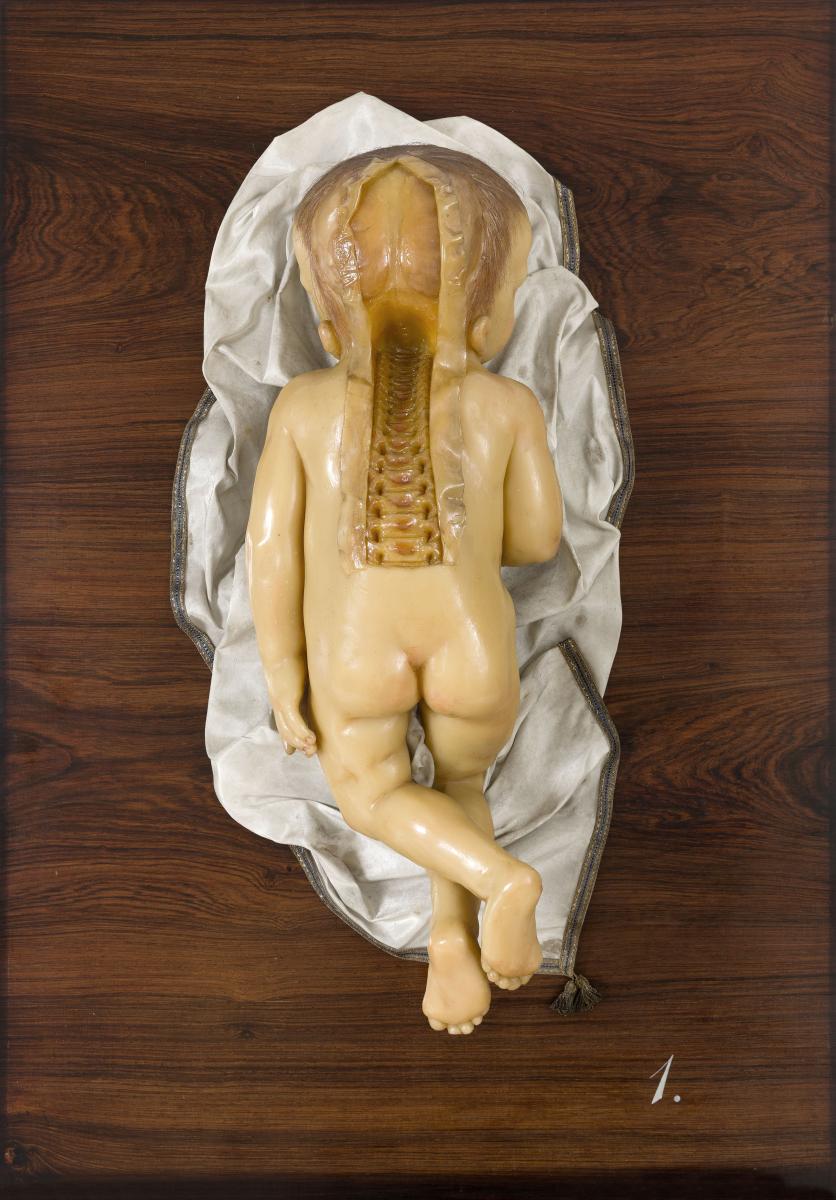 1. Die gleiche Fehlbildung mit einem Kopf, aber zwei Gesichtern (Diprosopus), von hinten, bei der die den Wirbelkanal bedeckenden Schichten zur Darstellung der verbreiterten Wirbel weggenommen wurden.