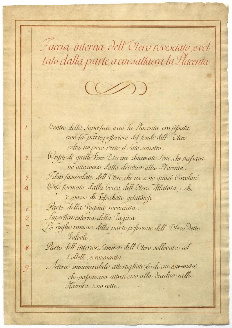 Der Text ist die ergänzende Beschreibung in italienischer Sprache zum anatomischen Wachsmodell einer Gebärmutter.