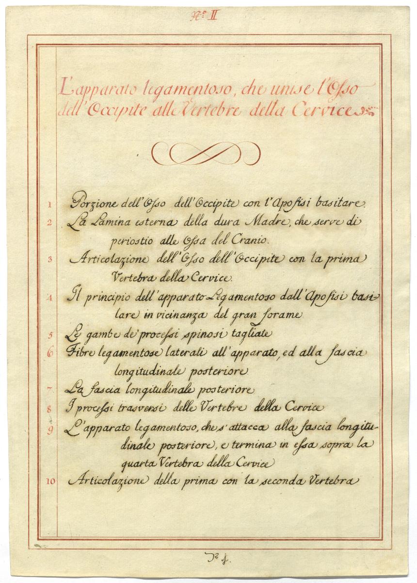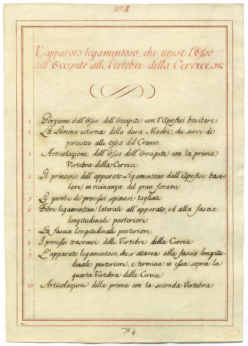 Der Text ist die ergänzende Beschreibung in italienischer Sprache zum anatomischen Wachsmodell der Knochen und Bänder des Halsbereiches.