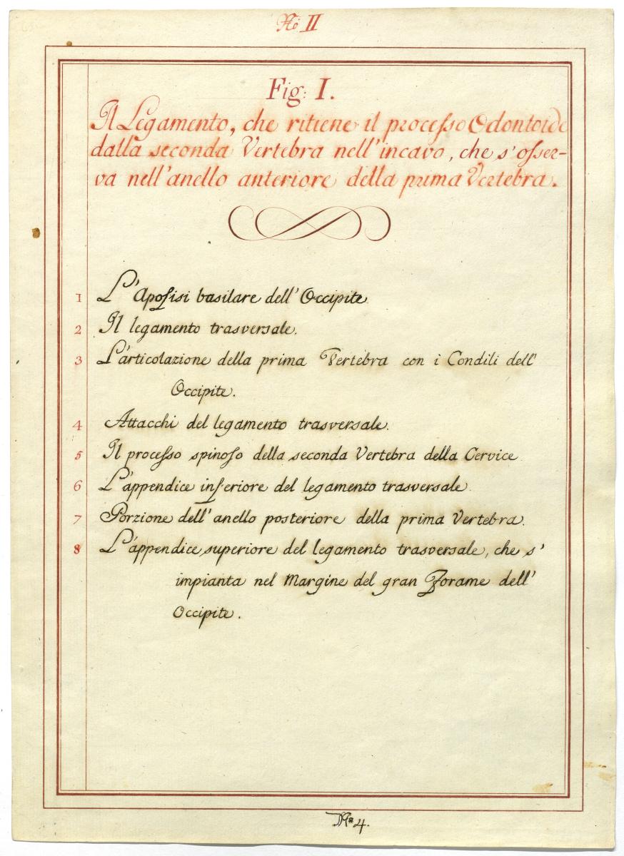 Der Text ist die ergänzende Beschreibung in italienischer Sprache zum anatomischen Wachsmodell der Knochen und Bänder des Halsbereiches.