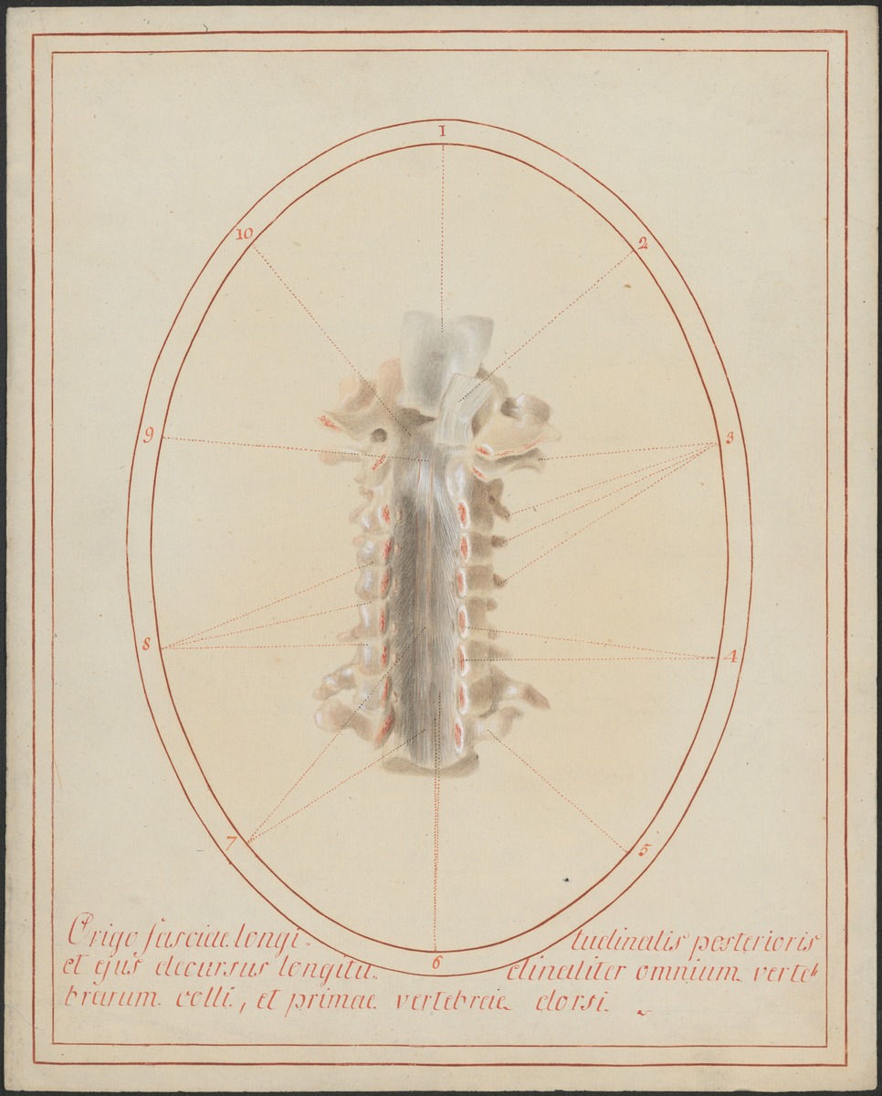 Ansicht der Halswirbelsäule und eines Teils des Hinterhauptbeins (Os occipitale) von dorsal in Normalposition. Der Wirbelbogen ist eröffnet, die Schuppe des Hinterhauptbeins ist entfernt und das Hinterhauptloch (Foramen magnum) ist eröffnet. Man sieht das hintere Längsband (Ligamentum longitudinale posterius), welches auf Höhe des ersten Halswirbels in die Membrana tectoria übergeht und an der Innenseite des Hinterhauptlochs befestigt ist.