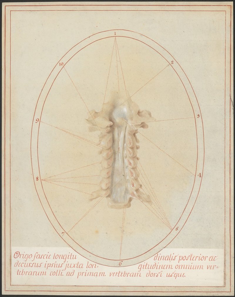 Ansicht der Halswirbelsäule und eines Teils des Hinterhauptbeins (Os occipitale) von dorsal in Überstreckung der Halswirbelsäule. Der Wirbelbogen ist eröffnet, die Schuppe des Hinterhauptbeins ist entfernt und das Hinterhauptloch (Foramen magnum) ist eröffnet. Man sieht das hintere Längsband (Ligamentum longitudinale posterius), welches auf Höhe des ersten Halswirbels in die Membrana tectoria übergeht und an der Innenseite des Hinterhauptlochs befestigt ist.