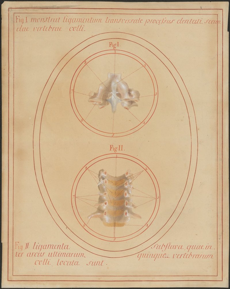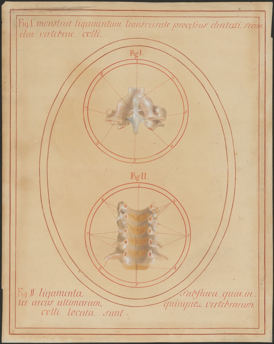 Fig. 1: 2/8: Das Ligamentum cruciforme atlantis mit seinen Längsbündeln und seinem queren Schenkel (Fasciculi longitudinales und Ligamentum transversum atlantis). Fig. 2: 2/9: Ansicht der Wirbelbögen des dritten bis siebten Halswirbels von vorne, die Wirbelkörper wurden entfernt. Man sieht seitlich die Kapseln der Zwischenwirbelgelenke (Articulationes intervertebrales) und mittig die gelben Bänder (Ligamenta flava) zwischen den einzelnen Wirbelbögen.