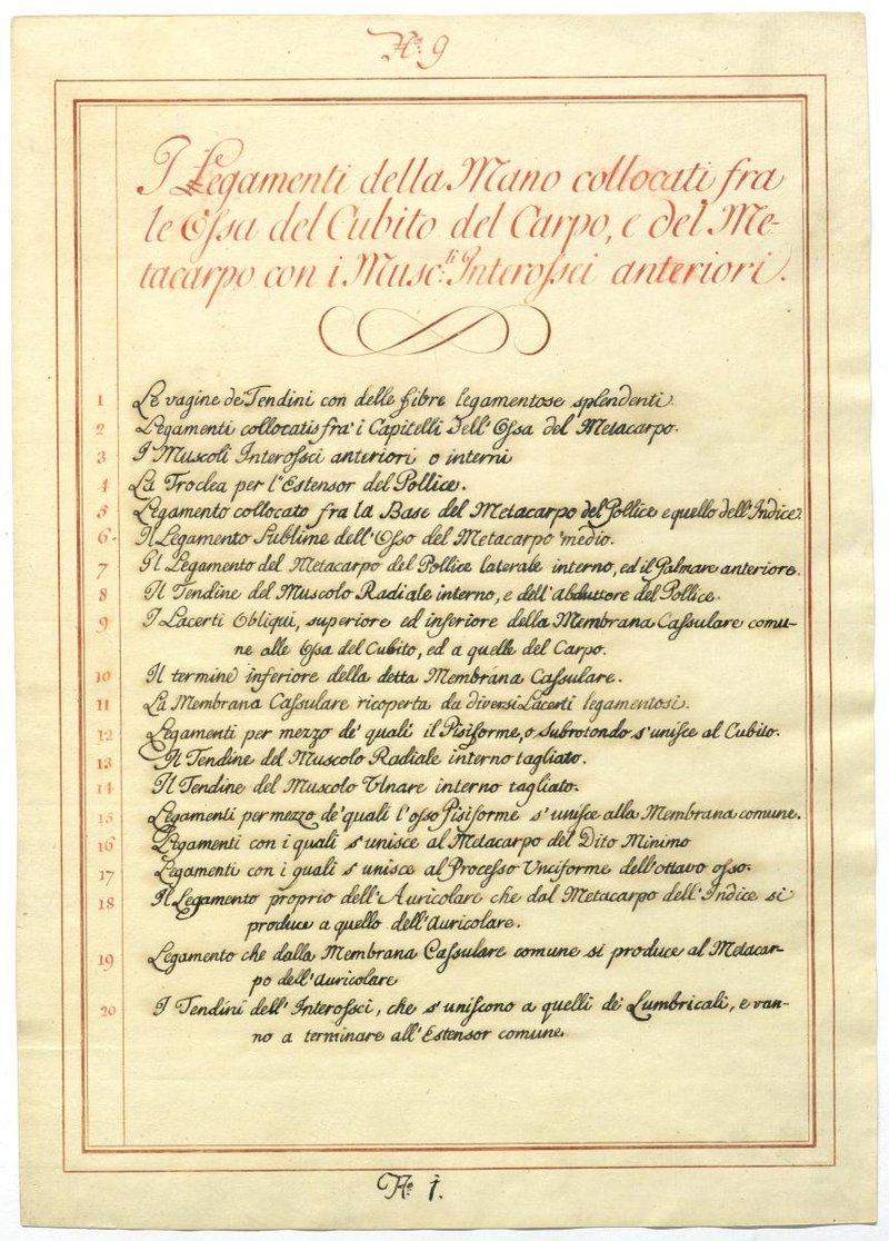 Der Text ist die ergänzende Beschreibung in italienischer Sprache zum anatomischen Wachsmodell der Hand.