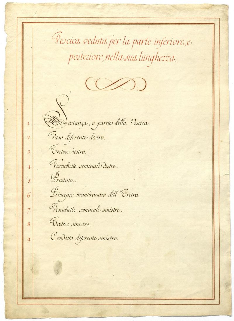 Der Text ist die ergänzende Beschreibung in italienischer Sprache zum anatomischen Wachsmodell der Harnblase und Harnröhre beim Mann.