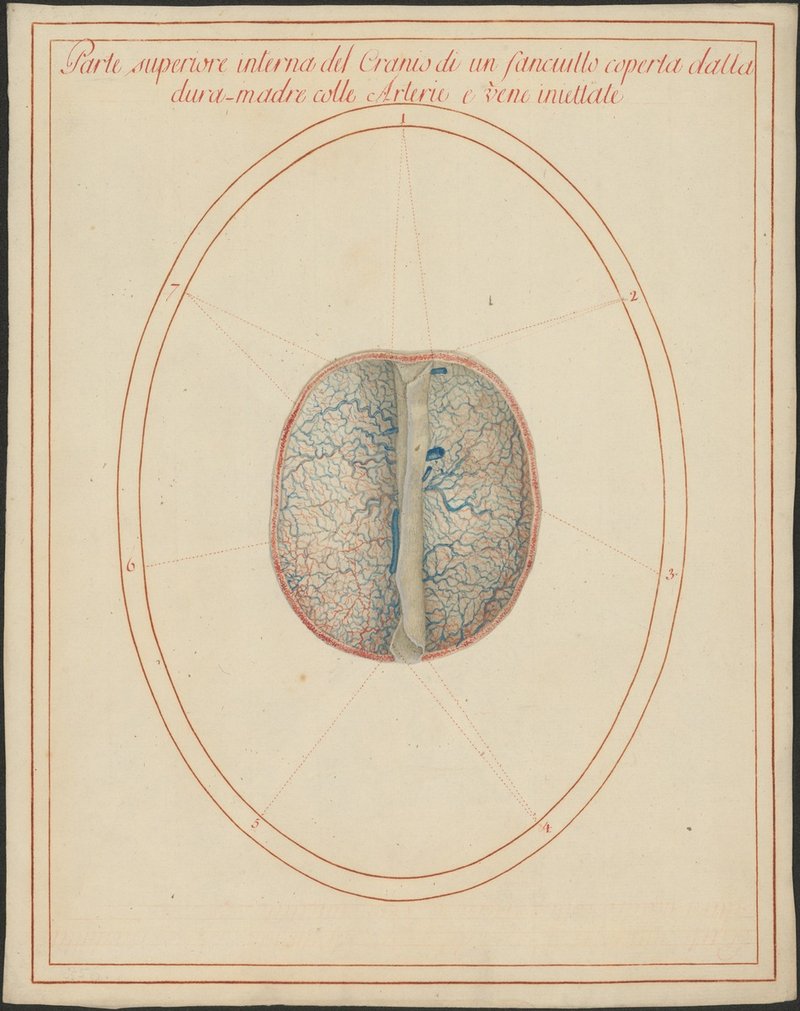 Die harte Hirnhaut (Dura mater encephali) und ihre Blutgefäße bei einem Kind.