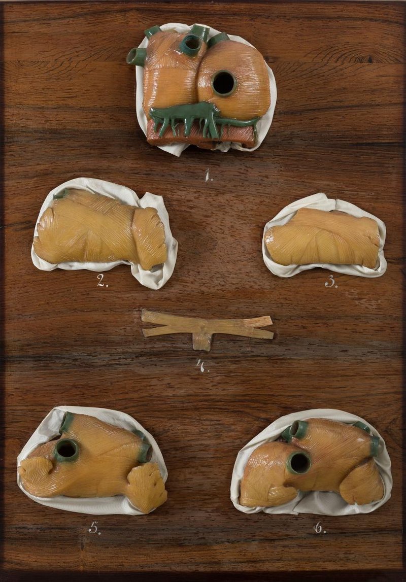 1. Der Faserverlauf der oberflächlichen Muskulatur der Herz- vorkammern (Atria cordis). 2. und 3. Eine Varietät im Faserverlauf der oberflächlichen Muskulatur der Vorhöfe (Atria cordis). 4. Ein Muskelbündel, das sich öfter an der Vorderfläche der Vorhöfe nahe der Herzbasis hinter der Aorta findet. 5. Die Faserrichtung der Muskulatur im Bereich der Vorkammern (Atria cordis). Die Herzohren (Auriculae atriorum) wurden etwas hochgezogen. 6. Der Faserverlauf der Muskulatur im Bereich der Vorkammern (Atria cordis) und der Herzohren (Auriculae atriorum).