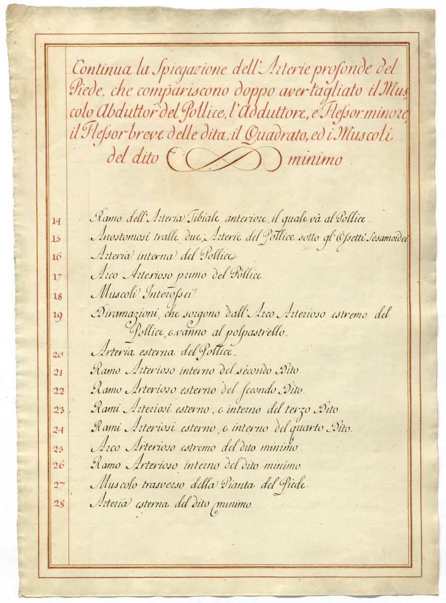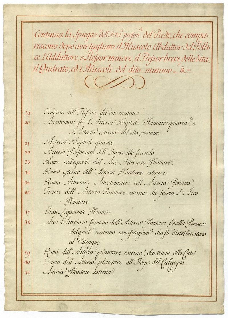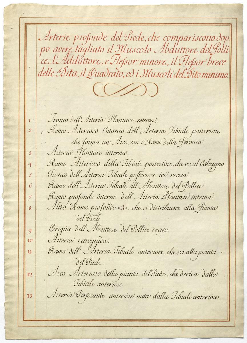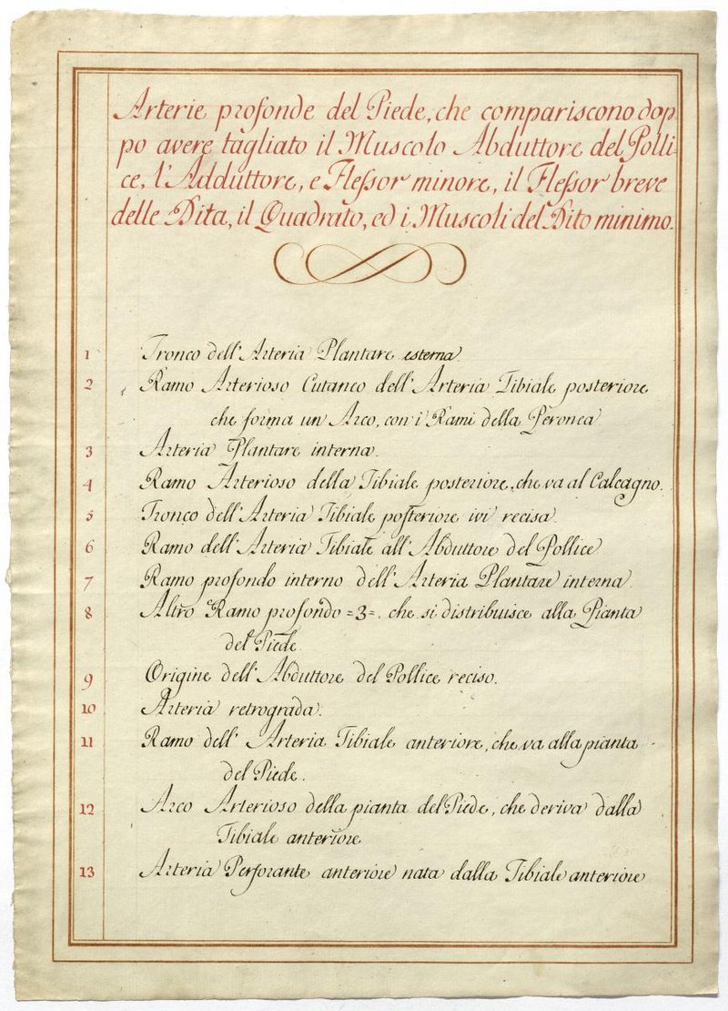 Der Text ist die ergänzende Beschreibung in italienischer Sprache zum anatomischen Wachsmodell der Fußsohlenarterie.