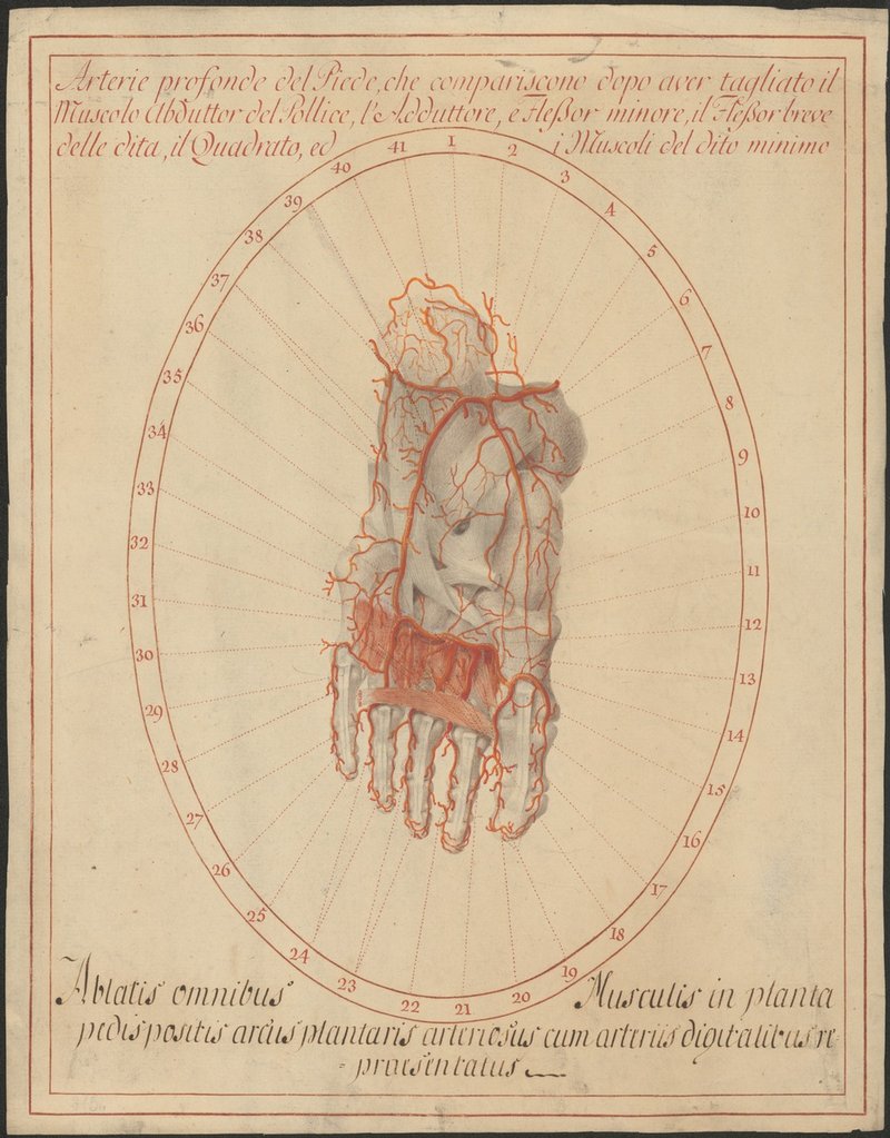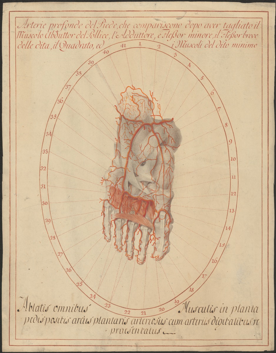 Die Arteria tibialis posterior und ihre tiefen Äste im Bereich der Fußsohle nach Entfernung der Plantaraponeurose und der Zehenbeuger sowie großer Teile der Klein- und Großzehenballenmuskulatur.