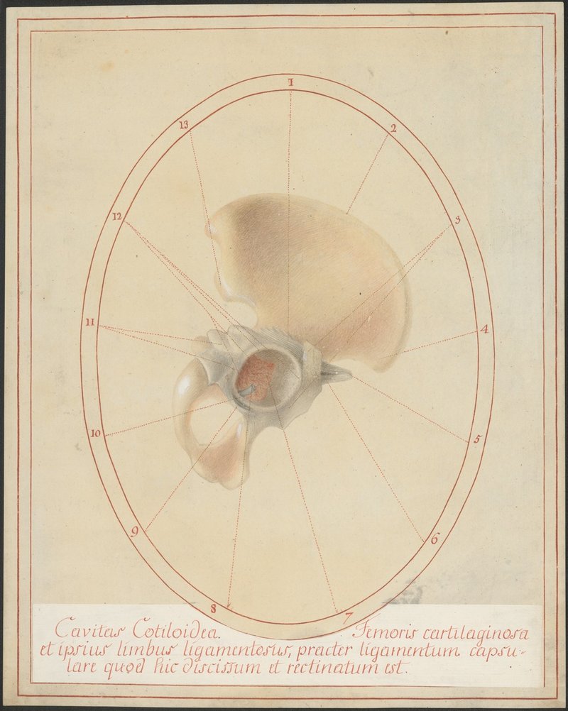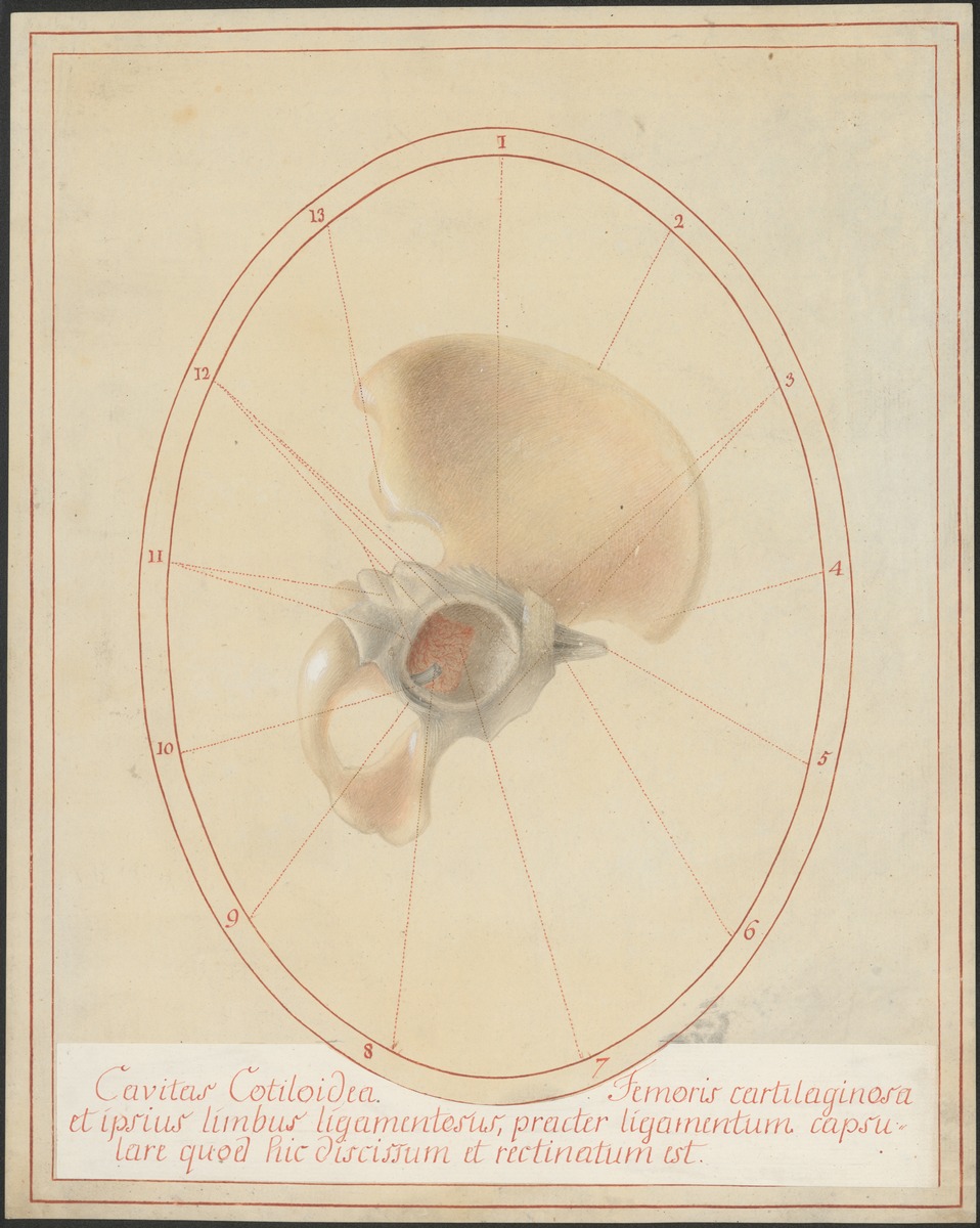 Übersicht über die Gelenkspfanne (Acetabulum) des Hüftgelenks. Der Oberschenkelknochen wurde vollständig entfernt, man sieht in der Tiefe der Gelenkspfanne den Stumpf des Ligamentum capitis femoris.